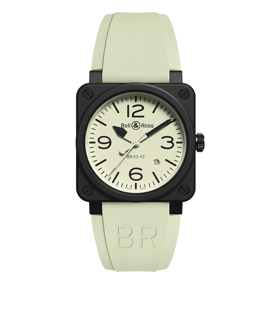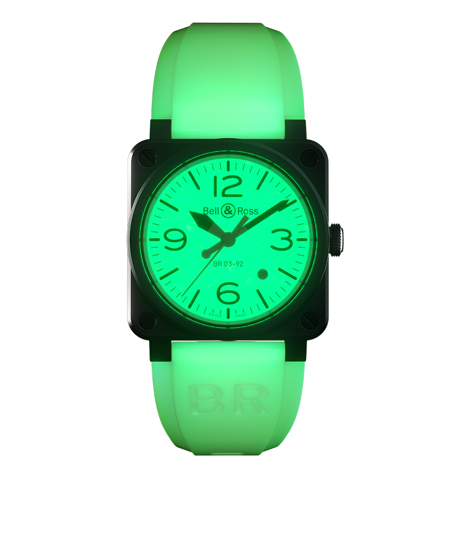 Vì sao chúng tôi lại dùng từ “cực đoan”? Đó là vì BR03-92 Full Lum có thể được xem như phiên bản đối nghịch đầy sống động của BR 03-92 Nightlum được ra mắt cách đây một năm. Trong khi Nightlum có mặt số màu đen với các số và cọc số phát sáng, thì Full Lum lại có mặt số ánh lân tinh với các số và cọc số màu đen – đi cùng dây đeo cao su phát ánh sáng rực rỡ. Để làm được điều này, Bell & Ross đã pha sắc tố lân quang vào cao su polymer tổng hợp trước khi nó được ép nóng và đúc.