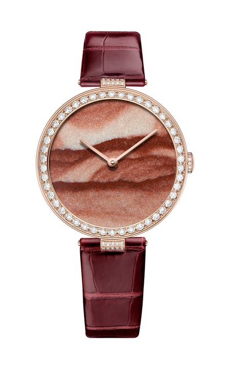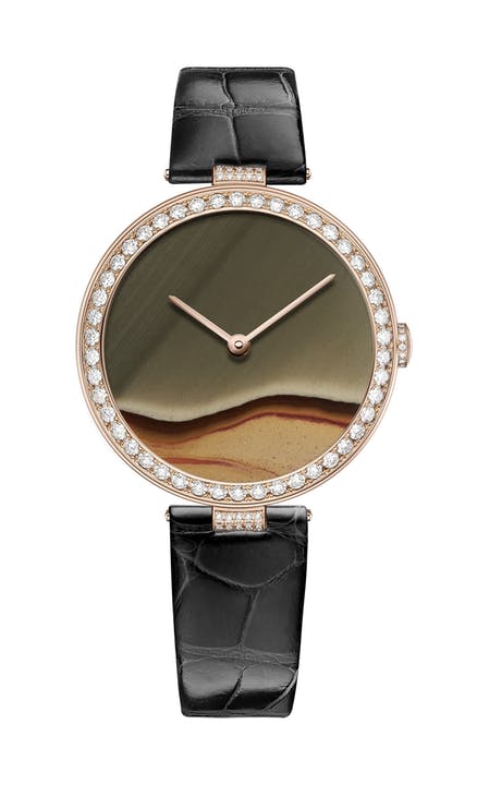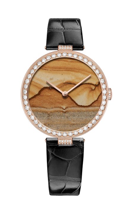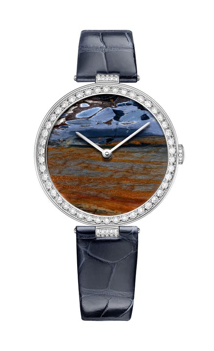 Được lấy lên từ độ sâu của lớp vỏ Trái đất, những viên đá đi kèm với kết cấu độc đáo tạo nét đẹp nên thơ trên mặt số đồng hồ. Tại đó, các cấu trúc khác biệt khắc họa nhiều cảnh quan đặc sắc của tự nhiên như sa mạc, rừng và đầm phá.