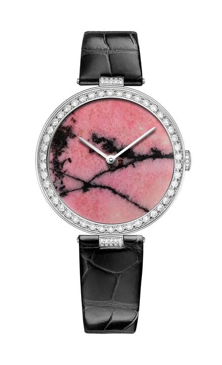 Kết hợp giữa kỹ thuật chế tác đồng hồ truyền thống và hiện đại, Chaumet đã tô điểm cho mỗi mặt số bằng đá với một bông hồng đính kim cương và viền bezel vàng trắng. Nhấn nhá nét hoàn thiện cuối cùng là dây đeo da cá sấu tương hợp với sắc màu mặt số.