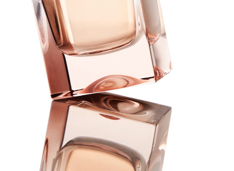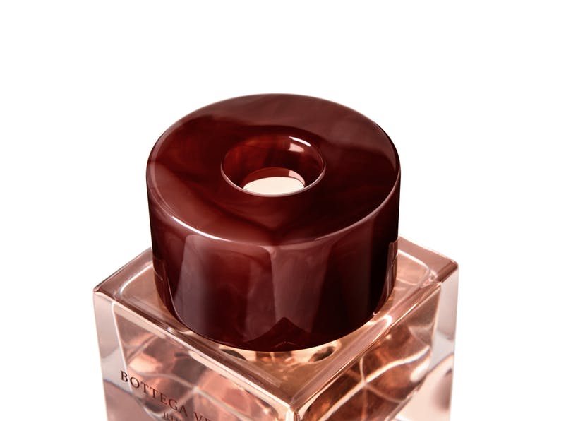 Bottega Veneta trau chuốt lọ nước hoa với chất liệu thủy tinh trong suốt phản chiếu màu hồng và xanh lá cây tương ứng với sắc màu biểu tượng dành riêng cho nàng và chàng.