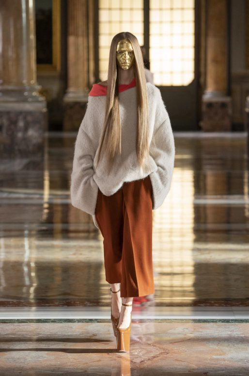 Và trong không gian Sala Grande sang trọng của Galleria Colonna ở Rome, bộ sưu tập mang đến một màn trình diễn nghệ thuật của các tài năng may mặc của nhà mốt. Chúng ta thấy sự thành thạo của họ trong việc tận dụng và phối hợp màu sắc như xanh neon, xanh ngọc lam và cam rực lửa với màu trắng kem và những màu trung tính, dễ chịu. Các chi tiết có kích thước quá khổ, hay những bông hoa hồng len tự hào tô điểm cho những chiếc áo khoác màu cam cháy và những vảy vàng phủ trên những chiếc váy. Găng tay da được trưng dụng khá nhiều, phối cùng với áo choàng và trang phục công sở. Để đối lập với những hình khối trên trang phục, những người mẫu sải bước trên đôi giày cao gót mà ngay cả Lady Gaga cũng sẽ xem xét lại. Thật khó để tưởng tượng việc đi chúng ở bất cứ đâu ngoài phòng khách. Nhưng sự thật là những đôi giày làm cho người mẫu lẫn các thiết kế trông thật khó tin. Phong cách make up cũng là một nét chấm phá độc đáo bộc lộ sự sang trọng một cách nhanh chóng, với những khuôn mặt mạ vàng tạo nên nét đẹp ma mị và quyến rũ lạ kỳ.