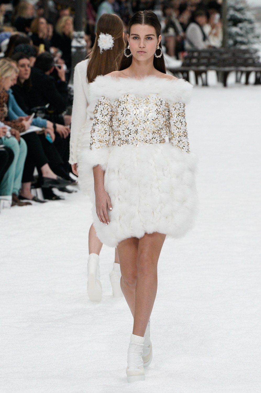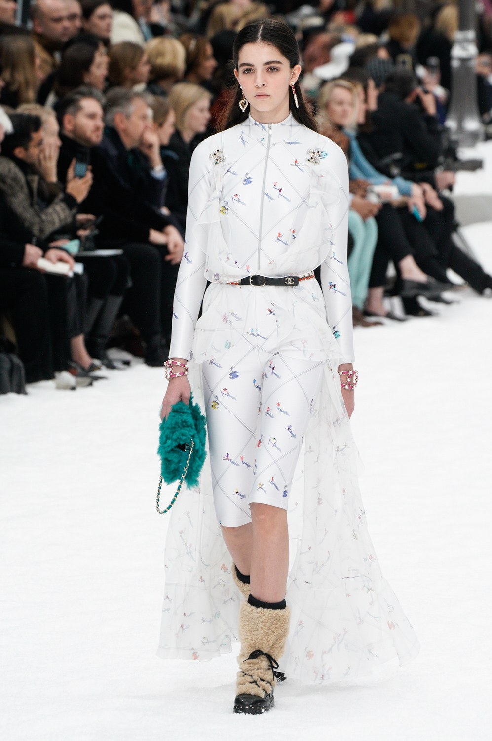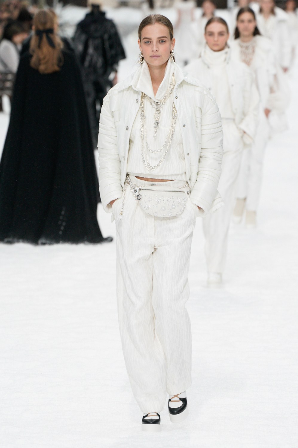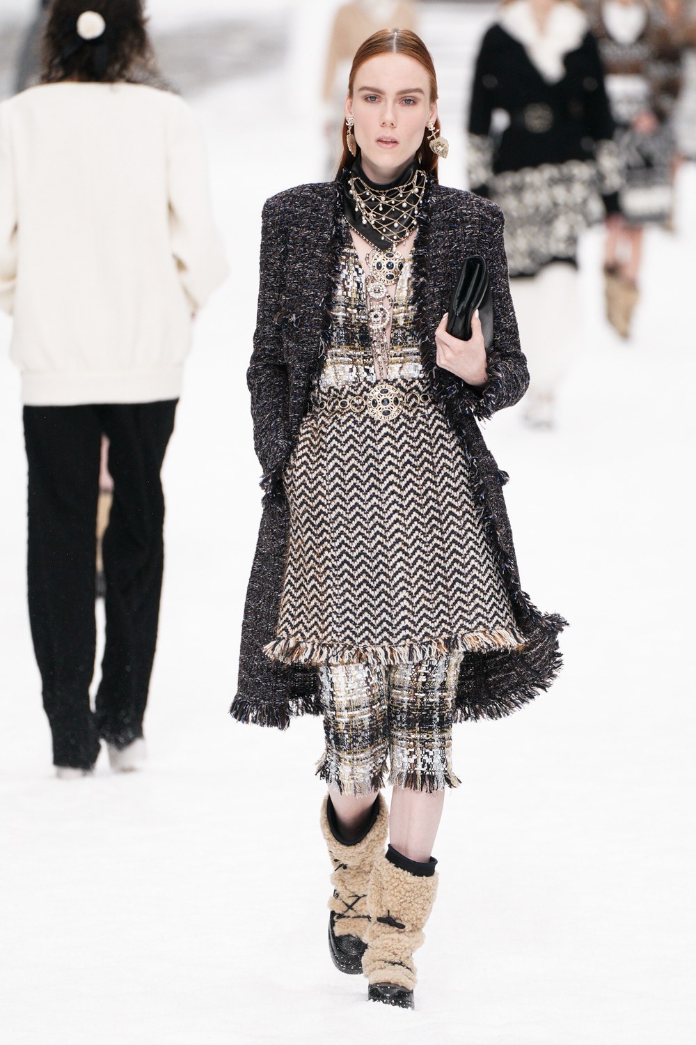 Thời khắc khiến mọi người nhớ lại Chanel Fall 2010 với tảng băng thật được vận chuyển từ Thụy Điển sang Pháp nhằm đưa ra thông điệp hiện tượng nóng lên toàn cầu của Trái đất. Nhưng sau 9 năm, giờ đây, Chanel Thu/Đông mô phỏng một ngọn núi tuyết hùng vĩ, có lẽ rặng núi ấy mượn lại hình ảnh về dãy Pyrénées ở Thụy Sĩ – nơi mùa đông đẹp nhất hành tinh, những căn nhà gỗ với mái nhà nặng trĩu tuyết rơi nép mình trong giá lạnh, những rừng cây lá kim trơ lá càng tăng thêm vẻ đượm buồn và im lìm đến lạ lùng. Và trên mỗi hàng ghế khách mời là một bản vẽ in hình Karl với Coco Chanel do chính cố Giám đốc phác thảo kèm dòng chữ “The beat goes on” – nhịp đập vẫn tiếp diễn.