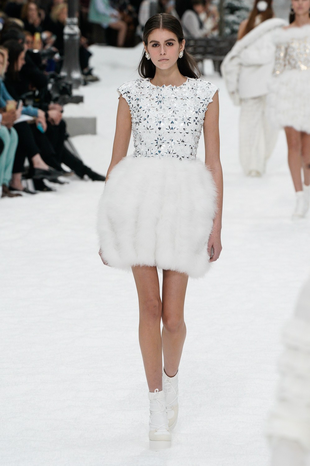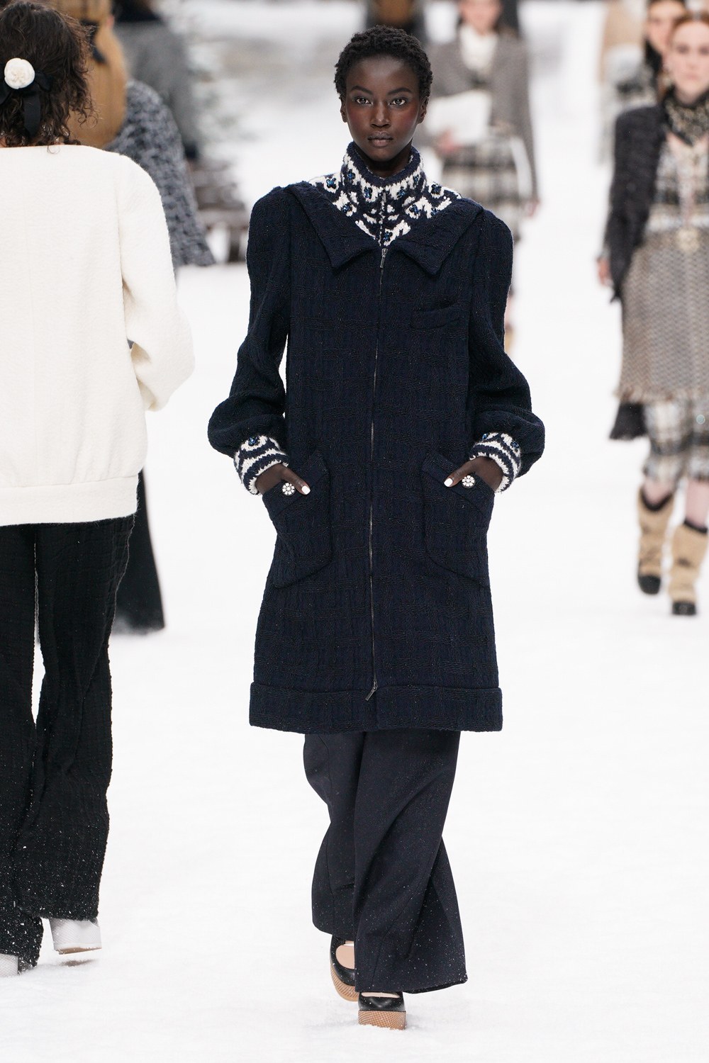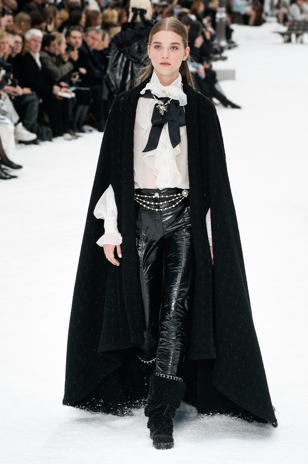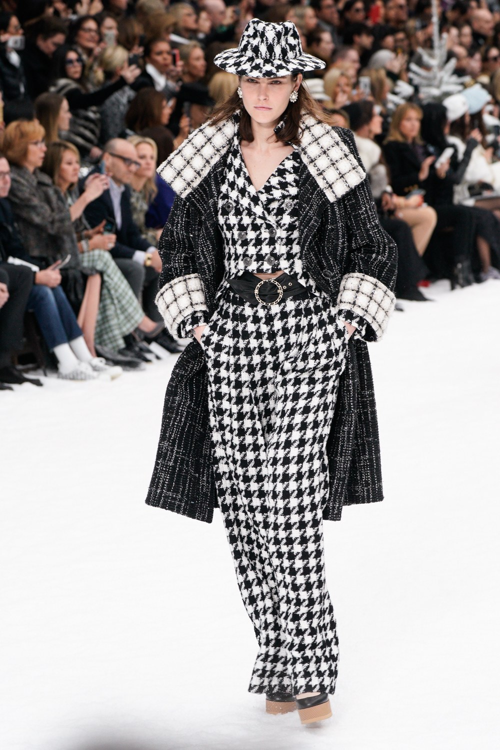 Thời khắc khiến mọi người nhớ lại Chanel Fall 2010 với tảng băng thật được vận chuyển từ Thụy Điển sang Pháp nhằm đưa ra thông điệp hiện tượng nóng lên toàn cầu của Trái đất. Nhưng sau 9 năm, giờ đây, Chanel Thu/Đông mô phỏng một ngọn núi tuyết hùng vĩ, có lẽ rặng núi ấy mượn lại hình ảnh về dãy Pyrénées ở Thụy Sĩ – nơi mùa đông đẹp nhất hành tinh, những căn nhà gỗ với mái nhà nặng trĩu tuyết rơi nép mình trong giá lạnh, những rừng cây lá kim trơ lá càng tăng thêm vẻ đượm buồn và im lìm đến lạ lùng. Và trên mỗi hàng ghế khách mời là một bản vẽ in hình Karl với Coco Chanel do chính cố Giám đốc phác thảo kèm dòng chữ “The beat goes on” – nhịp đập vẫn tiếp diễn.