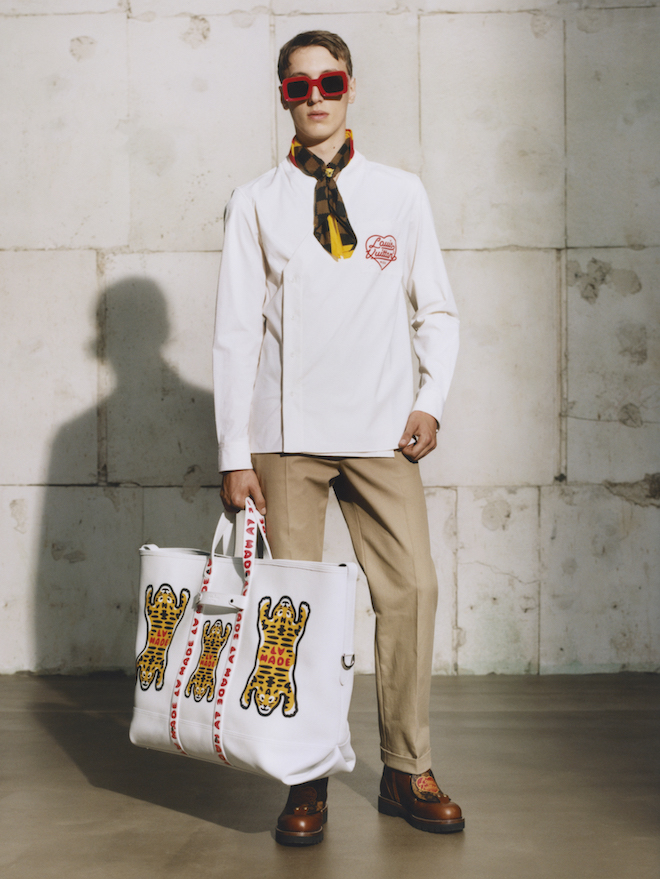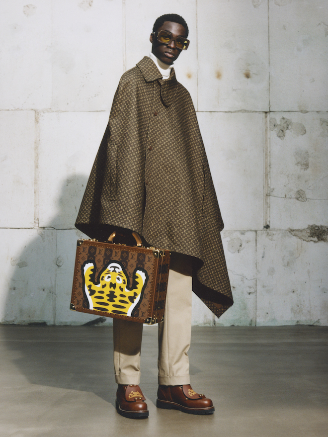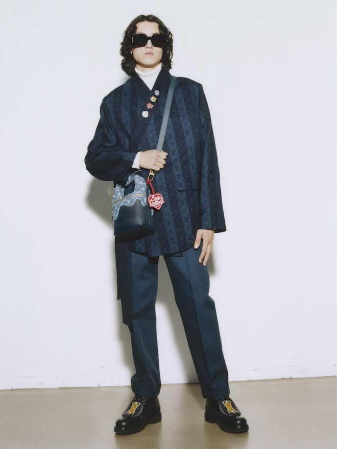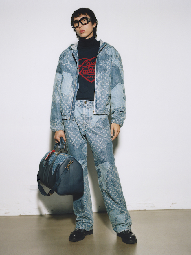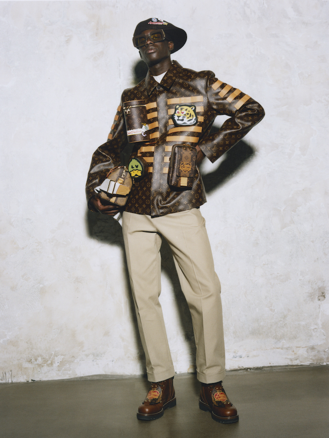 Họa tiết Monogram trở nên nổi bật trên những chiếc áo khoác kiểu bảo hộ lao động của những năm 1950 cũng như những bộ quần áo denim. Một chút cảm hứng từ đồng phục học sinh, chiếc áo khoác cộc tay được trang trí bằng các sọc Monogram được sử dụng trên lớp lót của các vali Louis Vuitton, trong khi quần tây kiểu chino mang dáng dấp như một cậu học sinh.
