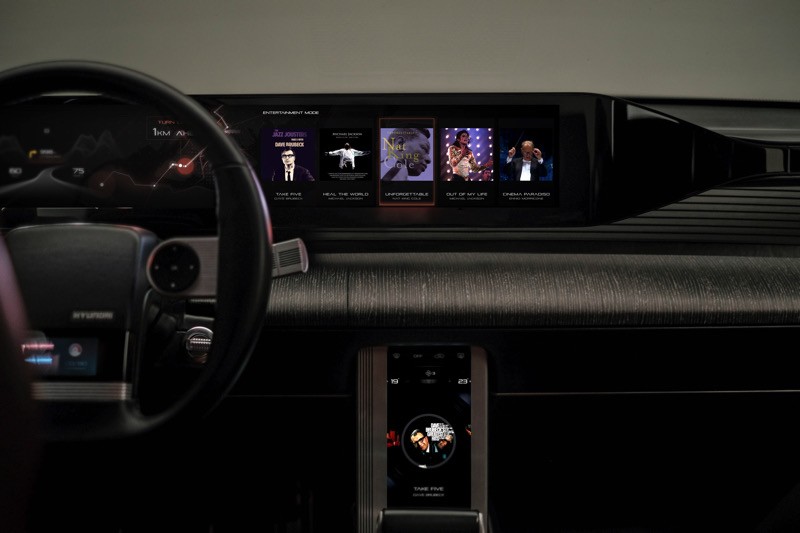 Câu chuyện lấy cảm hứng từ phong cách hoài cổ thậm chí còn thú vị hơn khi ở bên trong xe. Khái niệm “newtro”, như Hyundai ngụ ý, sử dụng tốt công nghệ hiện đại (“tính mới”) và giao diện kỹ thuật số trong khi vẫn giữ được bầu không khí cổ điển. Đầu tiên, hành khách được chào đón bằng hệ thống ánh sáng xung quanh màu đồng đúng chuẩn cổ điển có từ những thiết bị âm thanh hi-fi thập niên 80. Toàn bộ không gian nội thất được chiếu sáng bởi hai tia sáng xuất phát từ hai bên táp-lô gặp cột B tạo thành điểm nhấn đẹp mắt và phản chiếu qua gương vô cực.
