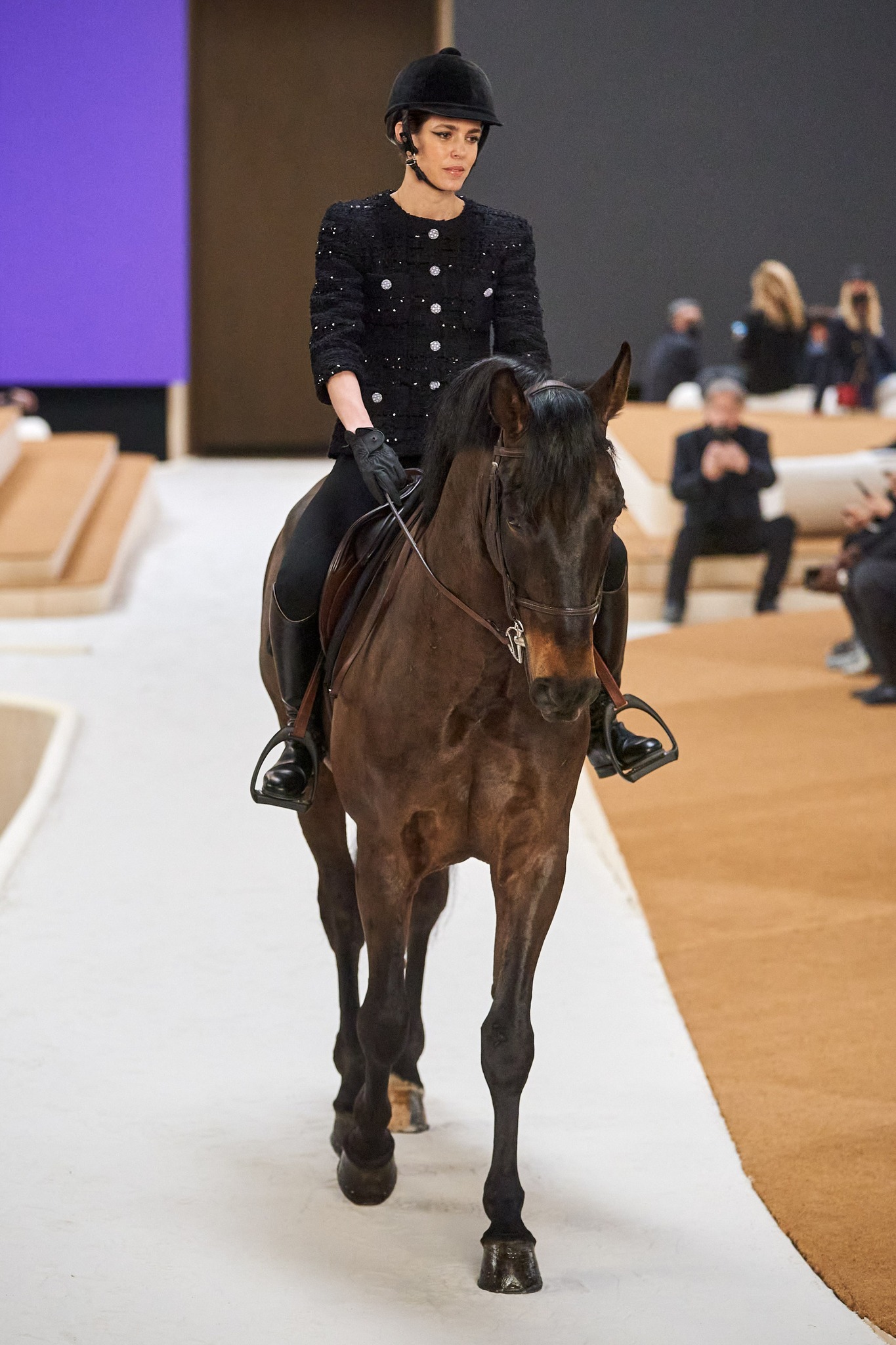 Charlotte Casiraghi, Công chúa Monaco và cũng là đại sứ của nhà mốt, mở đầu màn trình diễn với những nước kiệu điệu nghệ trên lưng ngựa rồi tăng tốc dần ngay trên sân khấu được sắp đặt của Xavier. Trong khi đó, nghệ sĩ Sébastien Tellier đang chơi nhạc trên một chiếc bục khác. “Xavier và Sébastien là bạn. Cùng với Charlotte, họ tạo thành một gia đình CHANEL mà tôi rất thích được ở cùng”, Virginie cho biết.