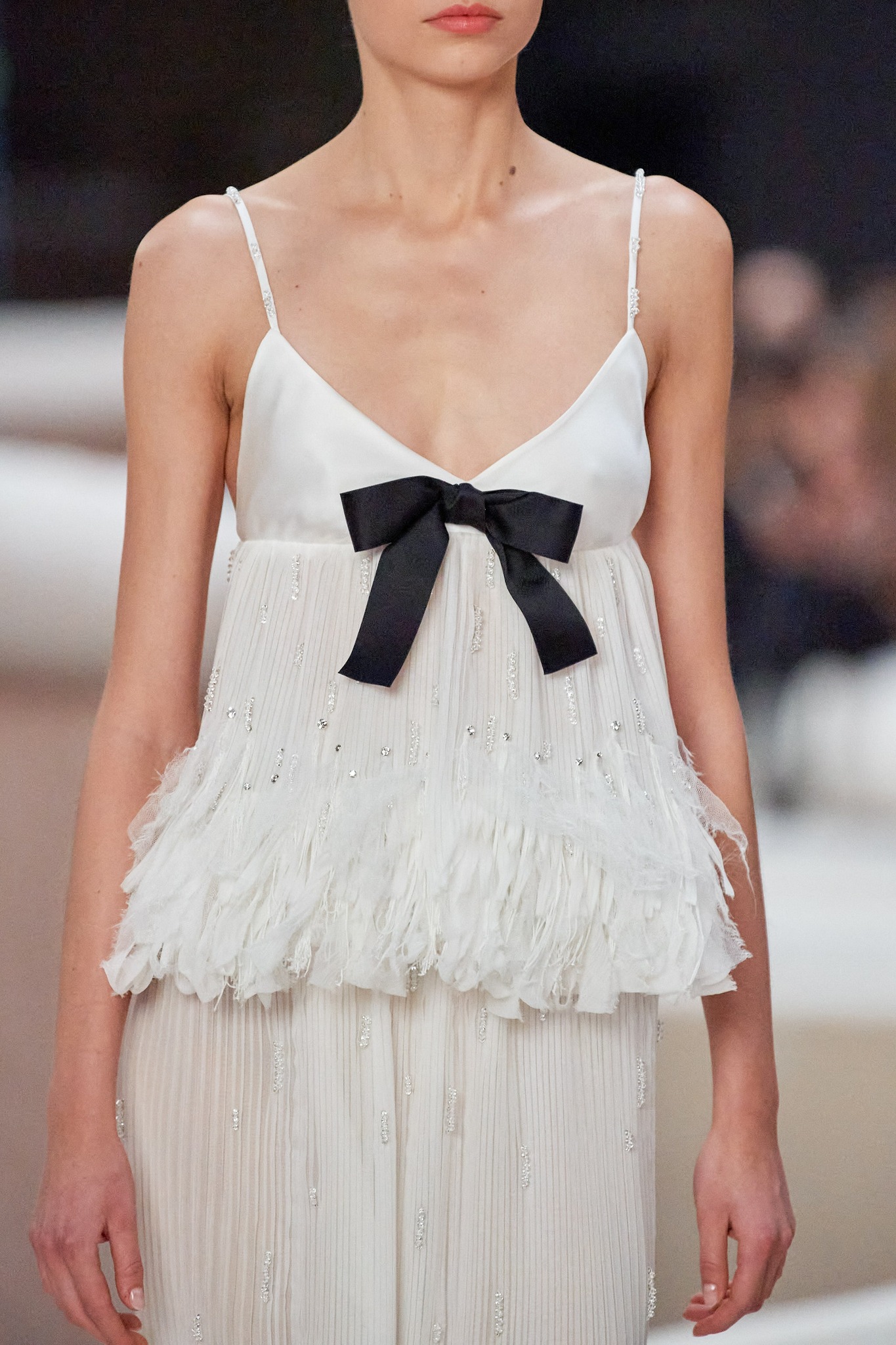 Những phom dáng và chất liệu tương phản – cứng và mềm, xẻ tà và giấu kín, voan mỏng manh cùng tweed chắc chắn,… tất cả được Virginie kết hợp một cách đầy ấn tượng. Những chiếc váy thanh tao bồng bềnh như lơ lửng. Sự phá cách của những bộ tweed kinh điển. Rất nhiều hoa, tua rua, macramé hay ren sáng màu bên cạnh những chiếc cúc đính đá quý đầy màu sắc. Và tất nhiên không thể bỏ qua 6 looks váy trắng điệu đà ở cuối và bộ váy cô dâu hai dây trắng muốt phủ dài đến mắt cá chân, đi cùng một vòng hoa bằng vải và đôi giày Mary-Janes cổ điển.