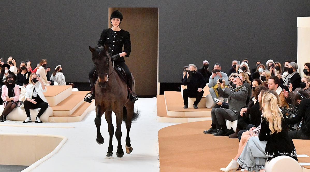 PARIS, FRANCE – JANUARY 25: (EDITORIAL USE ONLY – For Non-Editorial use please seek approval from Fashion House) Charlotte Casiraghi rides a horse on the runway during the Chanel Haute Couture Spring/Summer 2022 show as part of Paris Fashion Week at Le Grand Palais Ephemere on January 25, 2022 in Paris, France. (Photo by Dominique Charriau/WireImage)