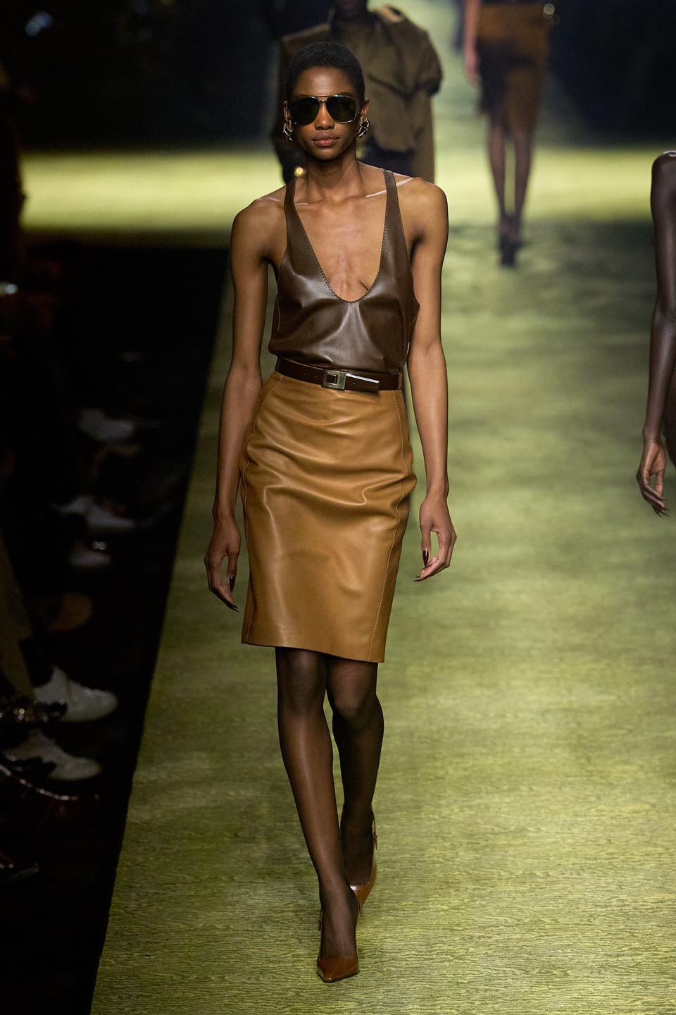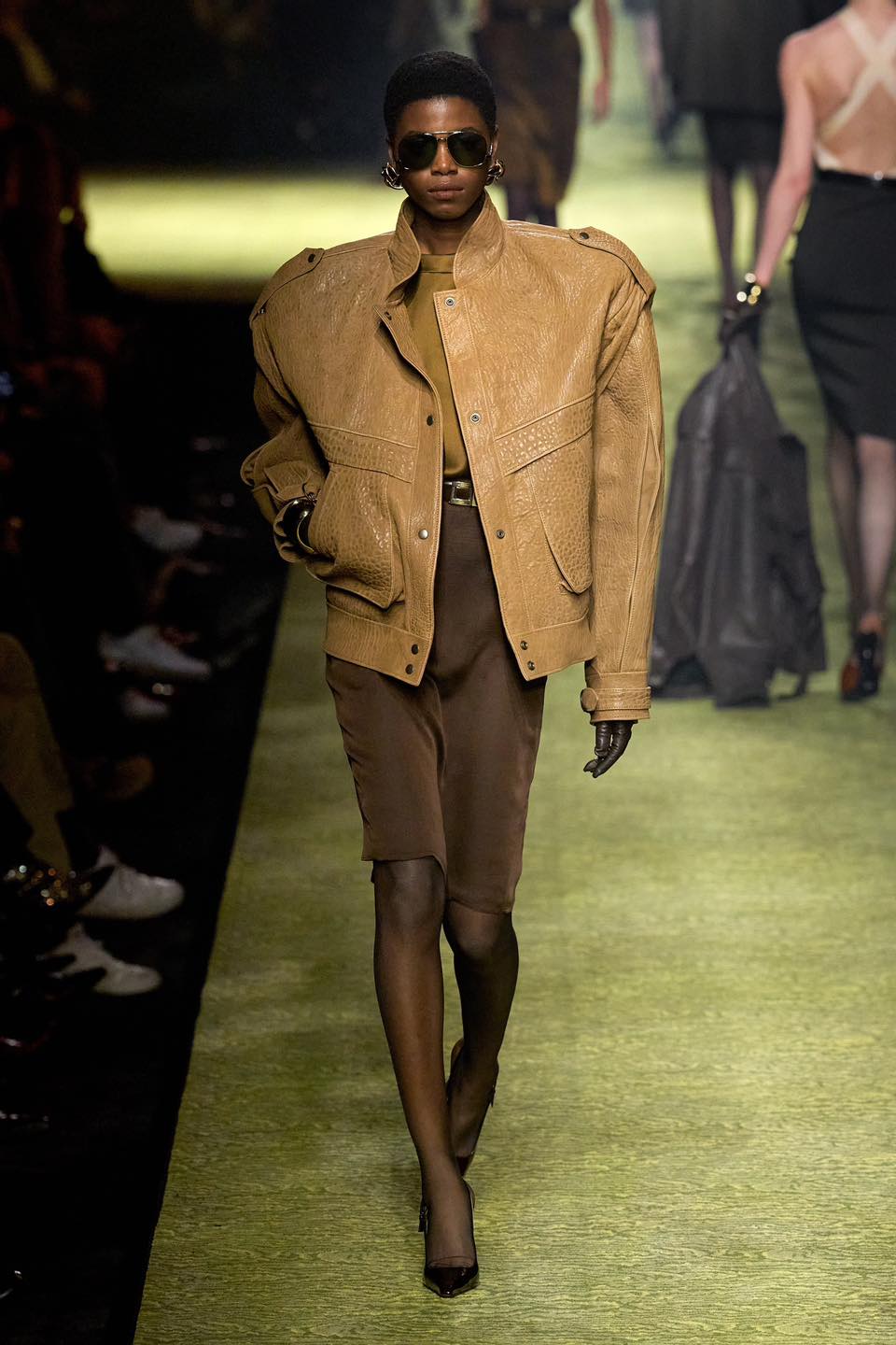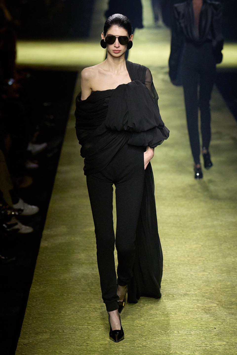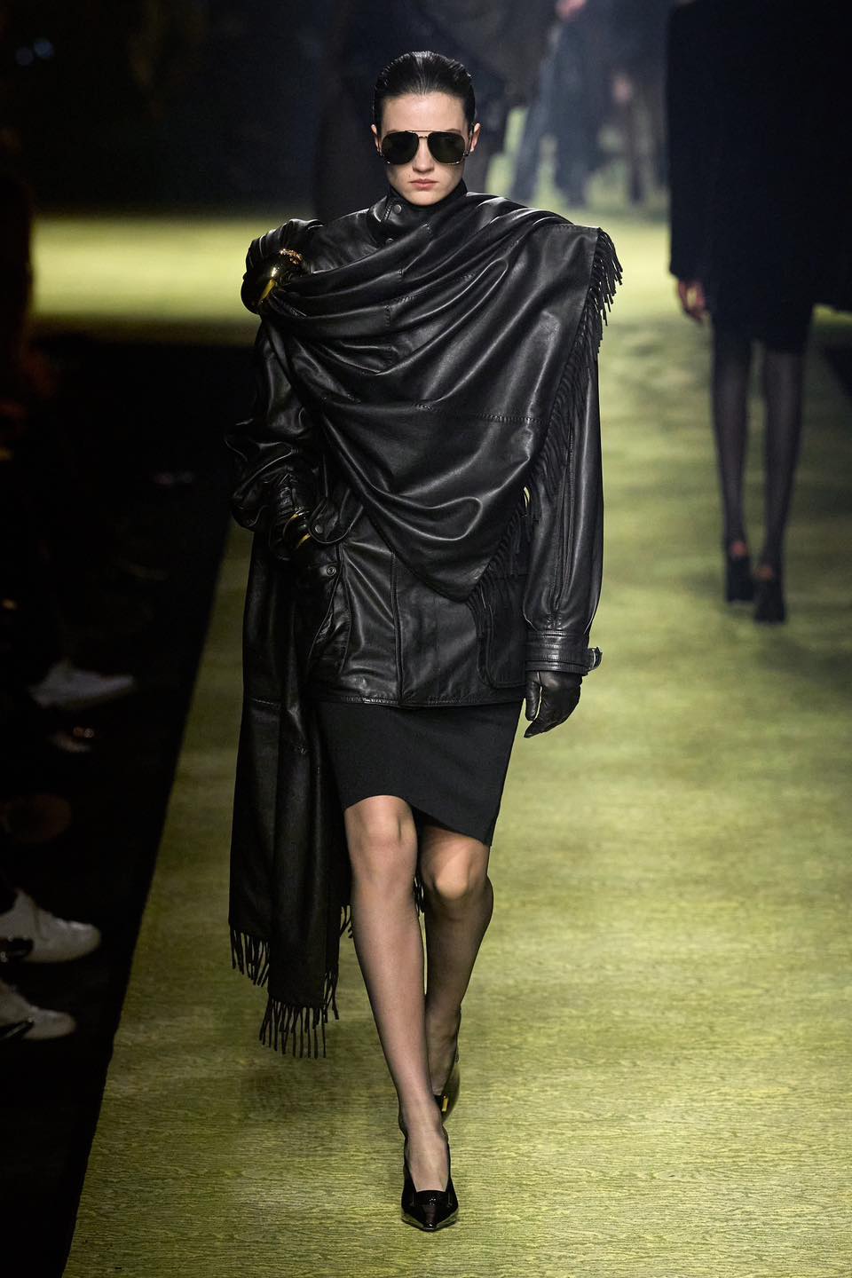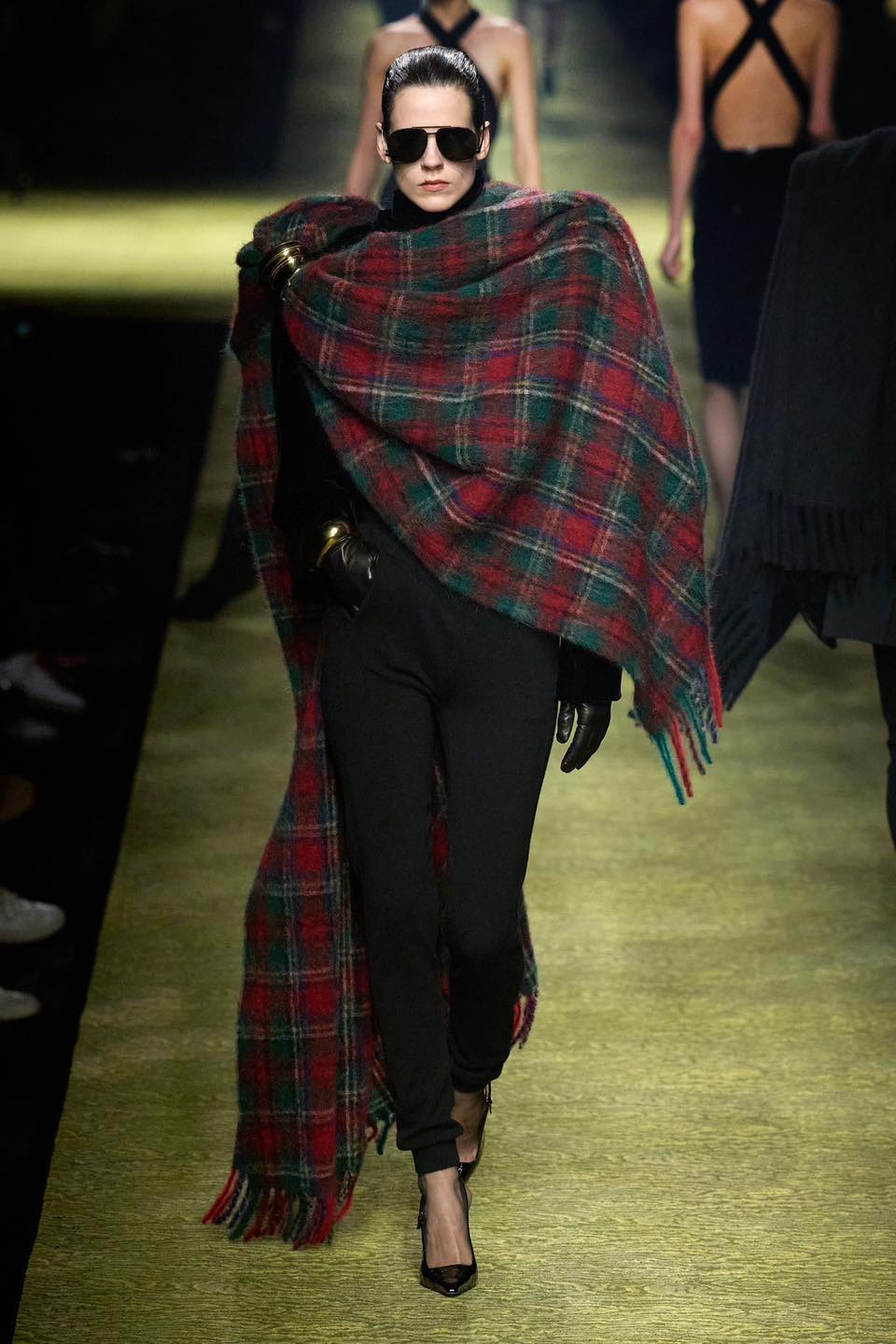 Những nếp gấp được lặp lại trong những chiếc khăn quàng cổ quấn quanh vai bằng đồ trang sức. Đúng với triết lý của Anthony Vaccarello là khơi gợi Yves Saint Laurent hơn là tái hiện, mỗi hình bóng giống như một ký ức: một ý tưởng hoặc một lý tưởng thẩm mỹ quen thuộc với tất cả chúng ta. Từng thiết kế thể hiện một cái nhìn thanh lịch, đó là điều mà Anthony nghĩ đến khi nói về bộ sưu tập mùa thu năm 2023 của YSL.
