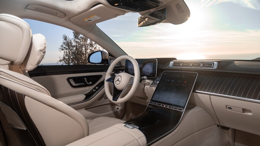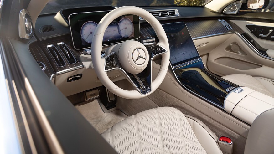 Không dễ để cải thiện nội thất của S-Class mới, nhưng Maybach đã làm được điều đó. Lấy cảm hứng từ du thuyền sang trọng và máy bay phản lực tư nhân, Maybach S 580 pha trộn sự sang trọng cổ điển với công nghệ mới nhất. Có sẵn với năm chỗ ngồi hoặc tùy chọn bố trí bốn chỗ, Maybach mới có màn hình, nội thất da, gỗ hoặc nhôm — hoặc kết hợp — bao phủ gần như mọi bề mặt. Trang trí bằng gỗ và nhôm được xếp theo chiều dọc mới trên bảng điều khiển, cửa ra vào và lưng ghế (cũng được thấy ở những chiếc S-Class thấp hơn), trông đặc biệt tinh tế với thiết kế mui xe chảy vào và xuyên qua cabin. Các chi tiết tinh xảo có ở khắp mọi nơi, từ loa Burmester hoàn thiện bằng nhôm gắn trên cửa sổ trời toàn cảnh đến các bàn đạp Maybach đặt riêng. Thậm chí còn có mùi hương đặc trưng của Maybach cho bộ khuếch tán trên xe.