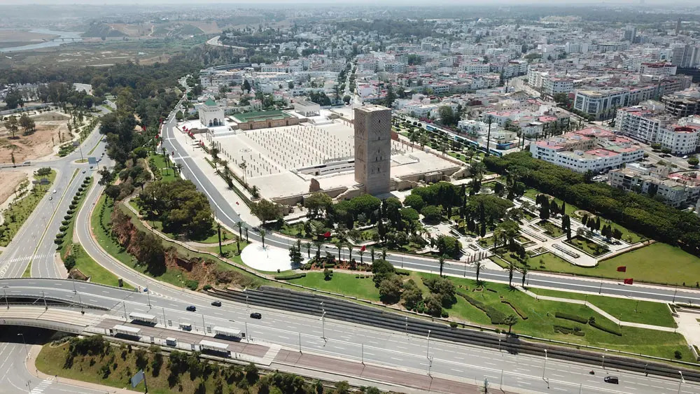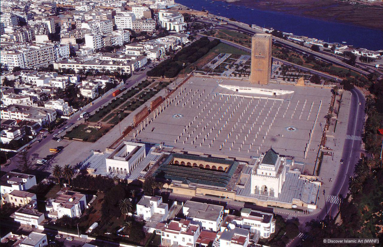 Toàn cảnh quảng trường lớn nhìn ra cửa sông Bou Regreg. Đối diện với tháp Hassan, tổ hợp tưởng niệm bao gồm lăng mộ Mohammed V (do kiến trúc sư Eric Võ Toàn thiết kế), nhà cầu nguyện và nhà trưng bày. Nguồn ảnh: Museum With No Frontiers (MWNF)