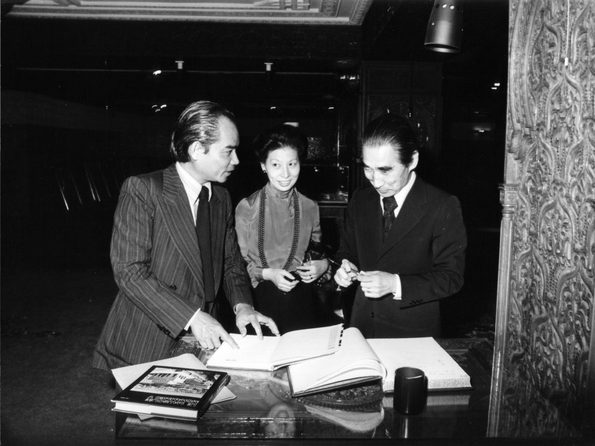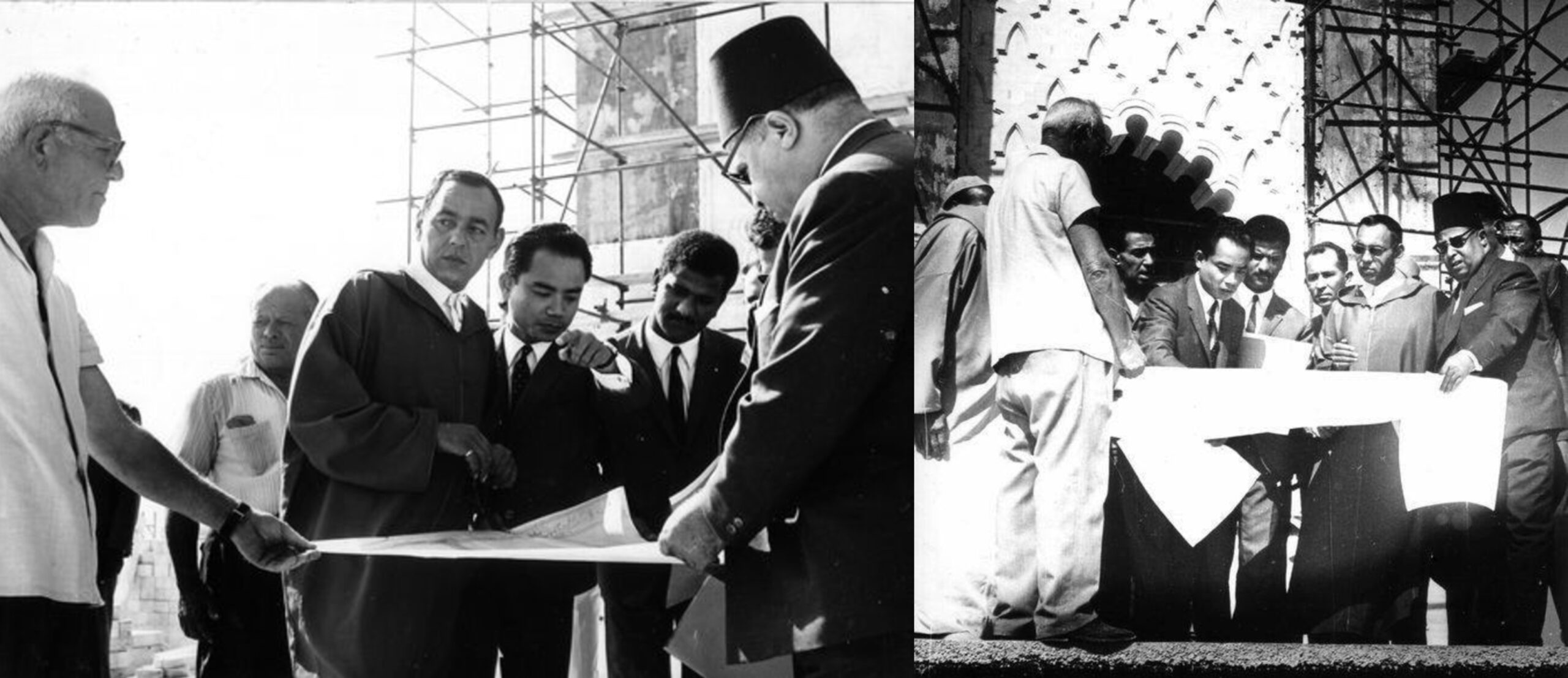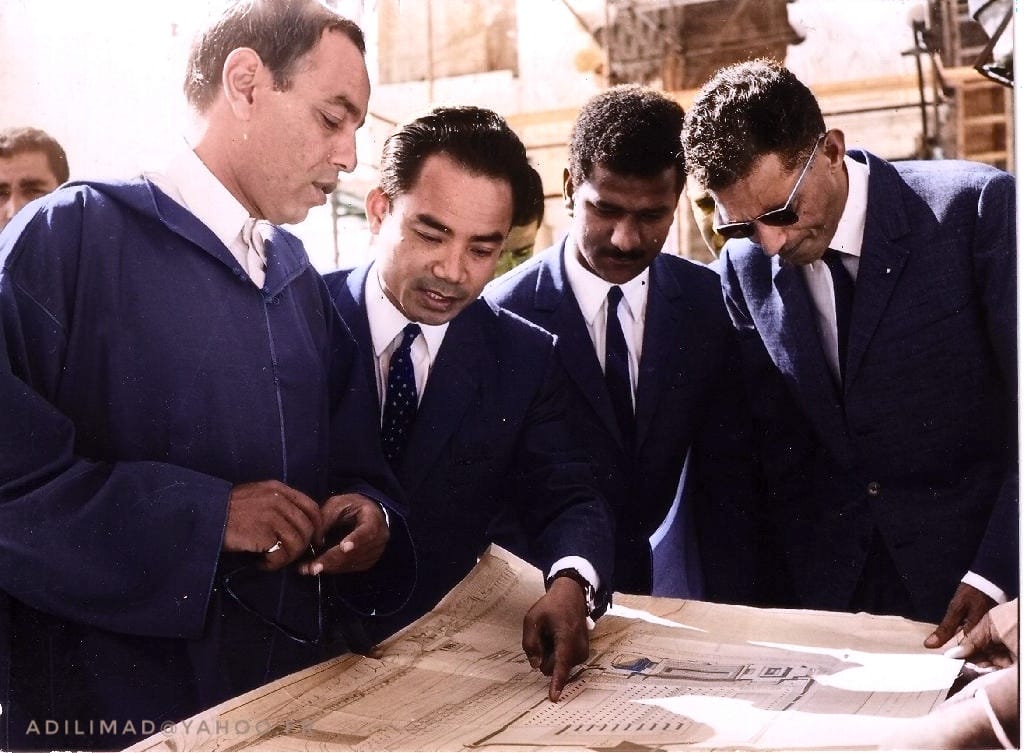 Kiến trúc sư Eric Võ Toàn làm việc trên bản vẽ cùng vua Hassan II và các công sự, ngay trước một phần công trình đang xây dựng của tổ hợp tưởng niệm ở Rabat, ảnh chụp trong khoảng thời gian 1961–1971. Nguồn: rol-benzaken.centerblog.net