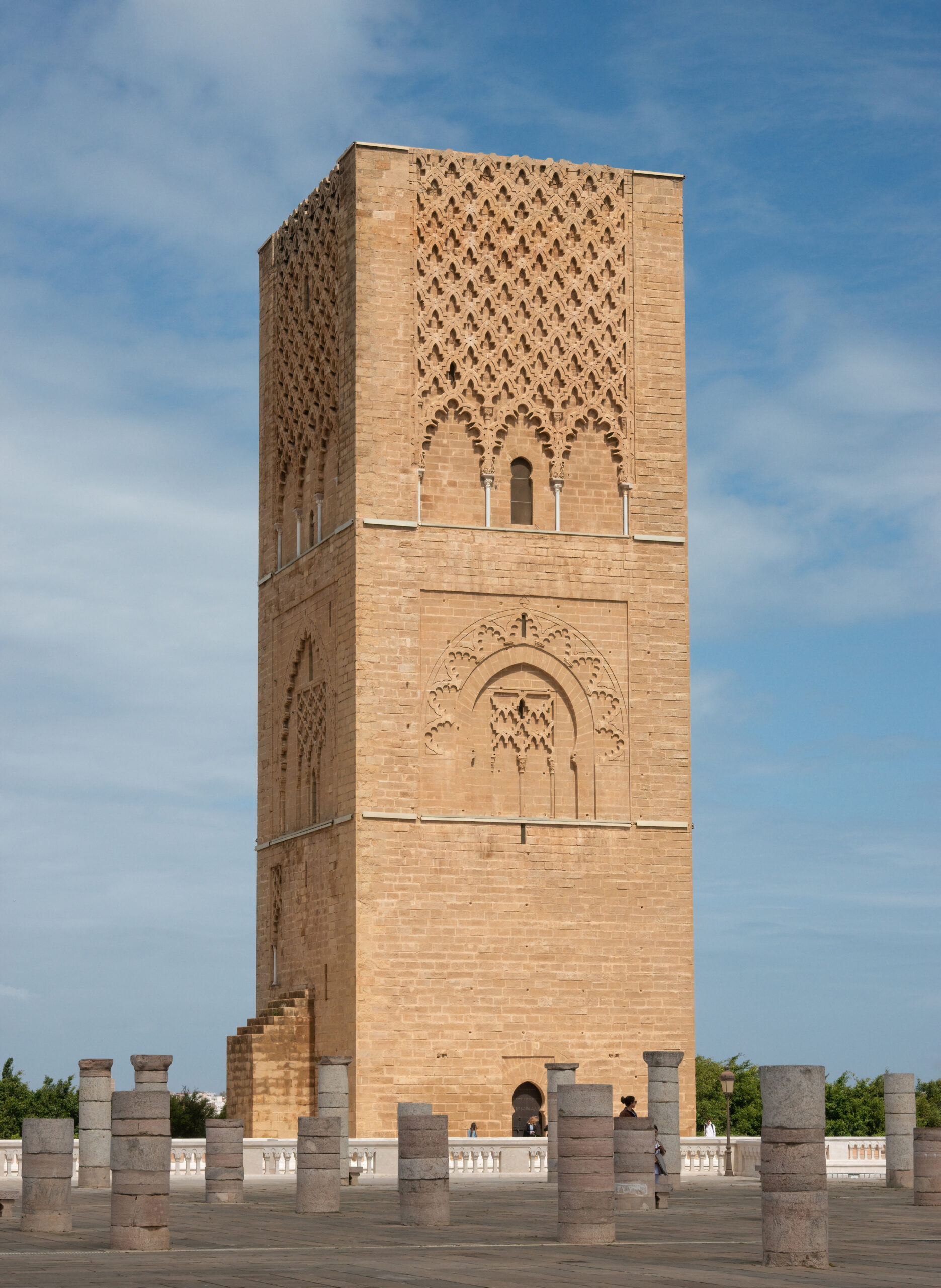Tháp Hassan nằm đối diện với tổ hợp công trình tưởng niệm vua Mohammed V. Tòa tháp này là một công trình chưa hoàn thiện, dự định ban đầu từ thế kỷ XII là xây một tòa tháp nhọn cao hơn 60 m (hoặc có thể là 80 m). Nguồn ảnh: Petar Milošević (CC BY-SA 4.0)