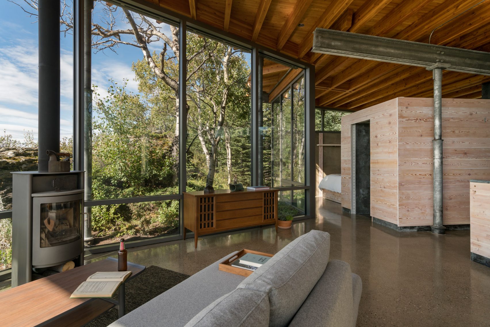Nội thất hoàn thiện của Douglas Fir với thép và sàn bê tông đánh bóng trong suốt. Vào ban đêm, ánh sáng nhân tạo giữa các dầm gỗ của trần nhà tỏa ra một vầng sáng lớn ra bên ngoài.
