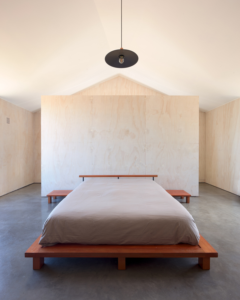 Ở dự án Casa Hualle của Ampuero Yutronic, cùng một bức tường đối diện với giường cho phép phòng tắm ở phía sau được ẩn với lối vào kép ở cả hai bên. Được ốp bằng gỗ sáng màu, giống như phần còn lại của căn phòng, phòng tắm vẫn được giấu kín nhưng có tính tích hợp cao, bao gồm bồn tắm nhìn ra cảnh quan, vòi hoa sen và nhà vệ sinh riêng. Bức tường ngăn cách không chạm trần và sàn được làm từ cùng một vật liệu để tạo ra sự liền mạch.