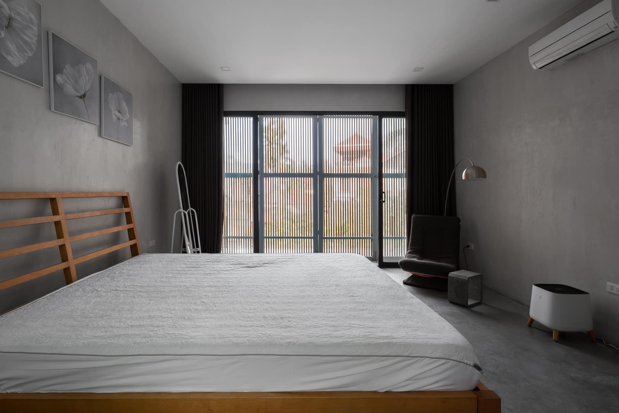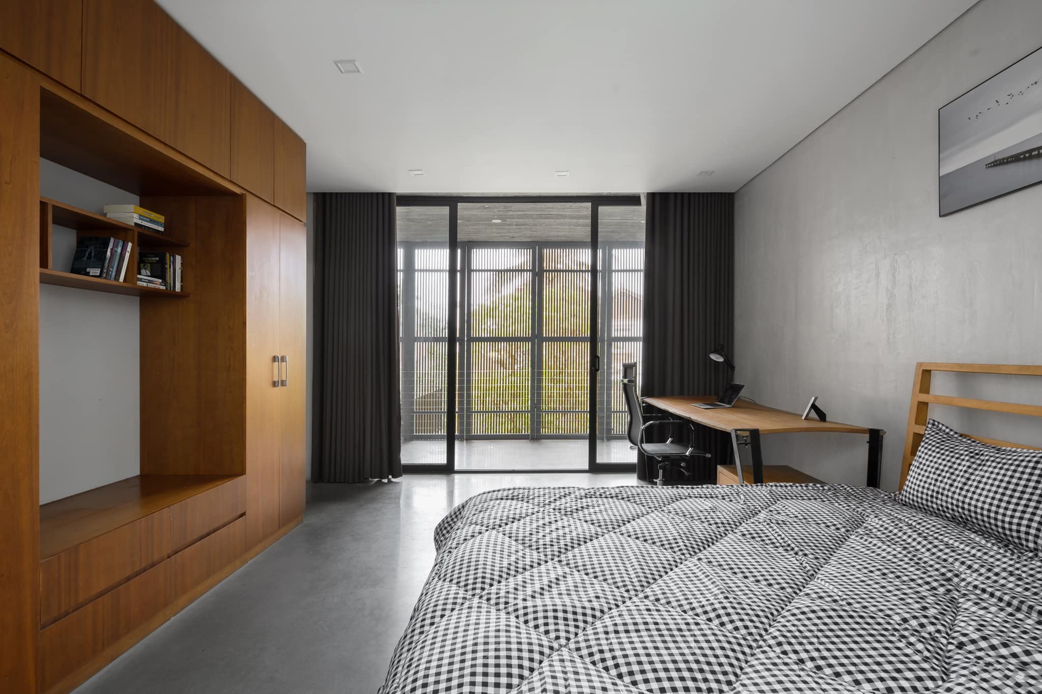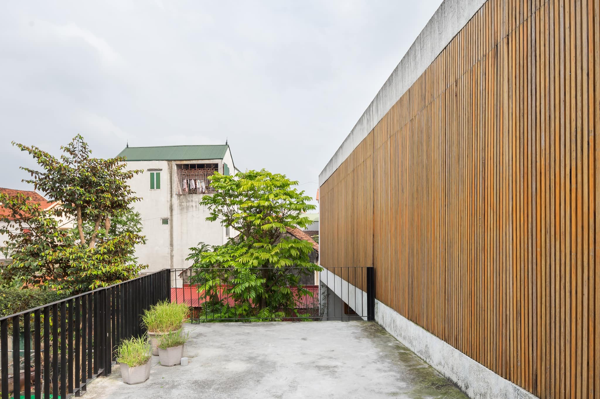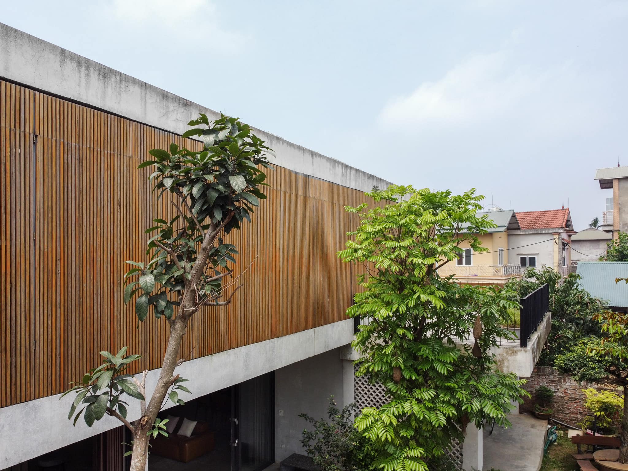Mặt tiền bằng hệ cửa với kết cấu khung sắt, được bao bọc bởi nan tre ép chạy xuyên suốt chiều ngang ngôi nhà, có thể đóng – mở linh hoạt bất cứ lúc nào. Hệ cửa có tác dụng giảm ánh sáng trực tiếp từ hướng đông, đảm bảo vấn đề quyền riêng tư và an ninh.