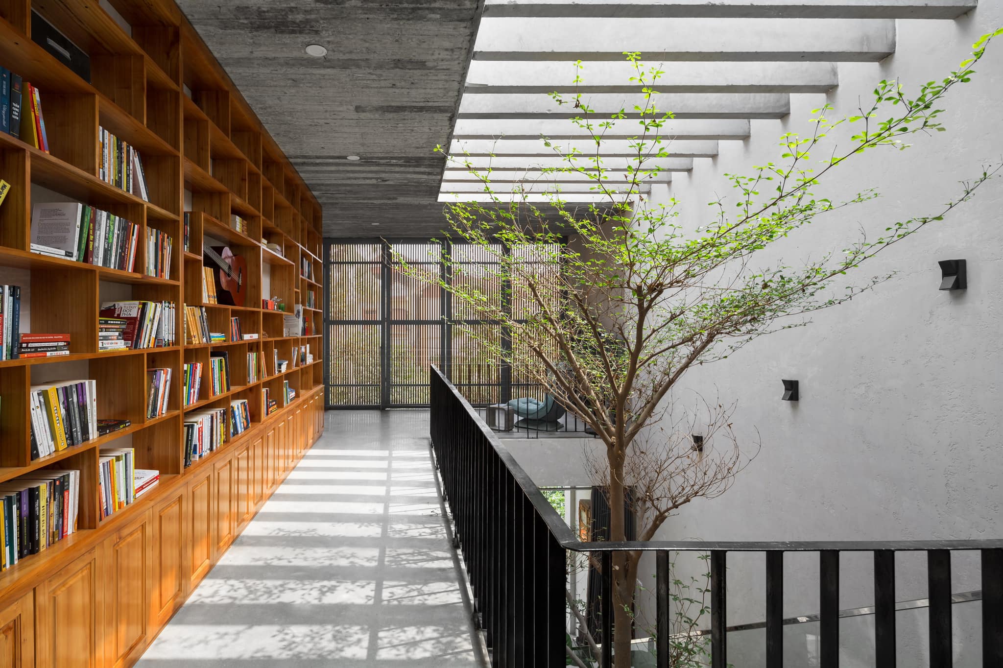 Nhóm kiến trúc sư cũng lựa chọn chất liệu hoàn thiện chủ yếu là bê tông có bề mặt nhám được hoàn thiện trực tiếp tại dự án và ở xưởng sản xuất. Cùng đó, gỗ màu hạt dẻ khiến không gian trở nên ấm cúng hơn.