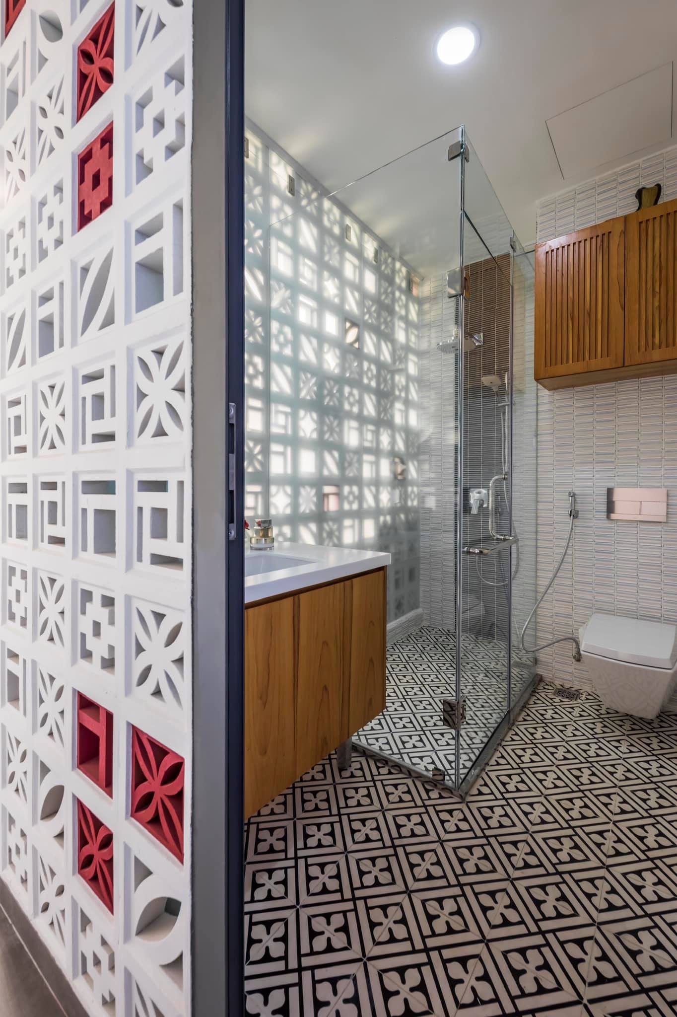 Lát những ô gạch trắng thoáng khí ở nhà tắm góp phần nâng tầm trải nghiệm thư giãn nhưng vẫn đảm bảo riêng tư tuyệt đối.