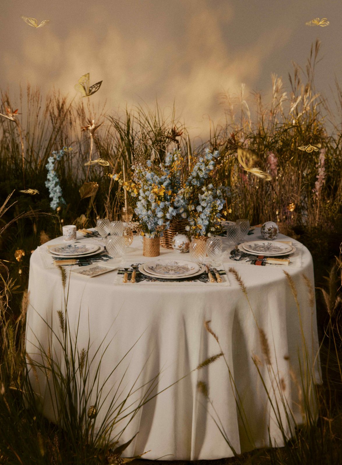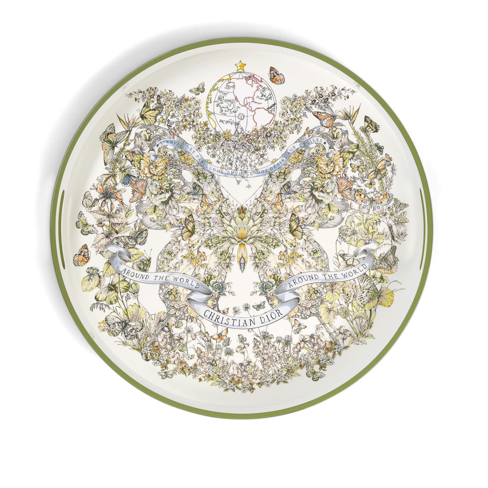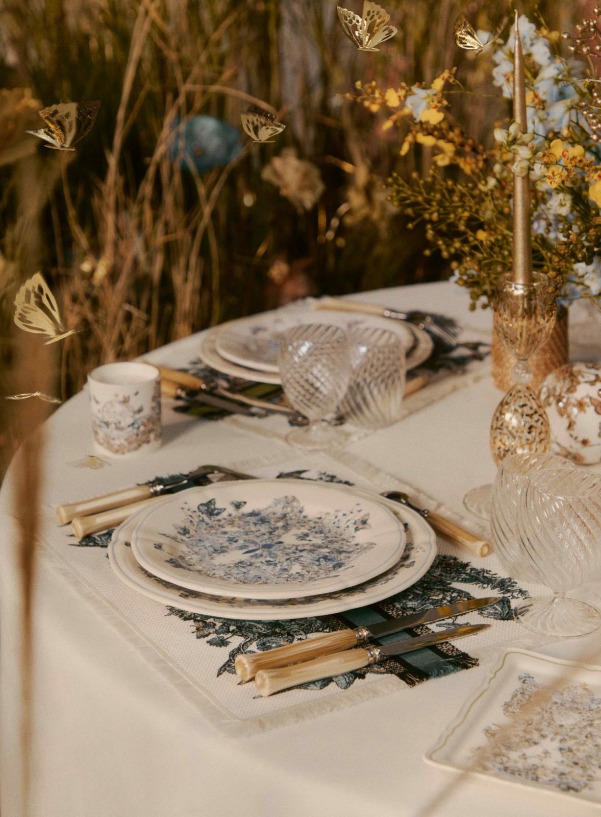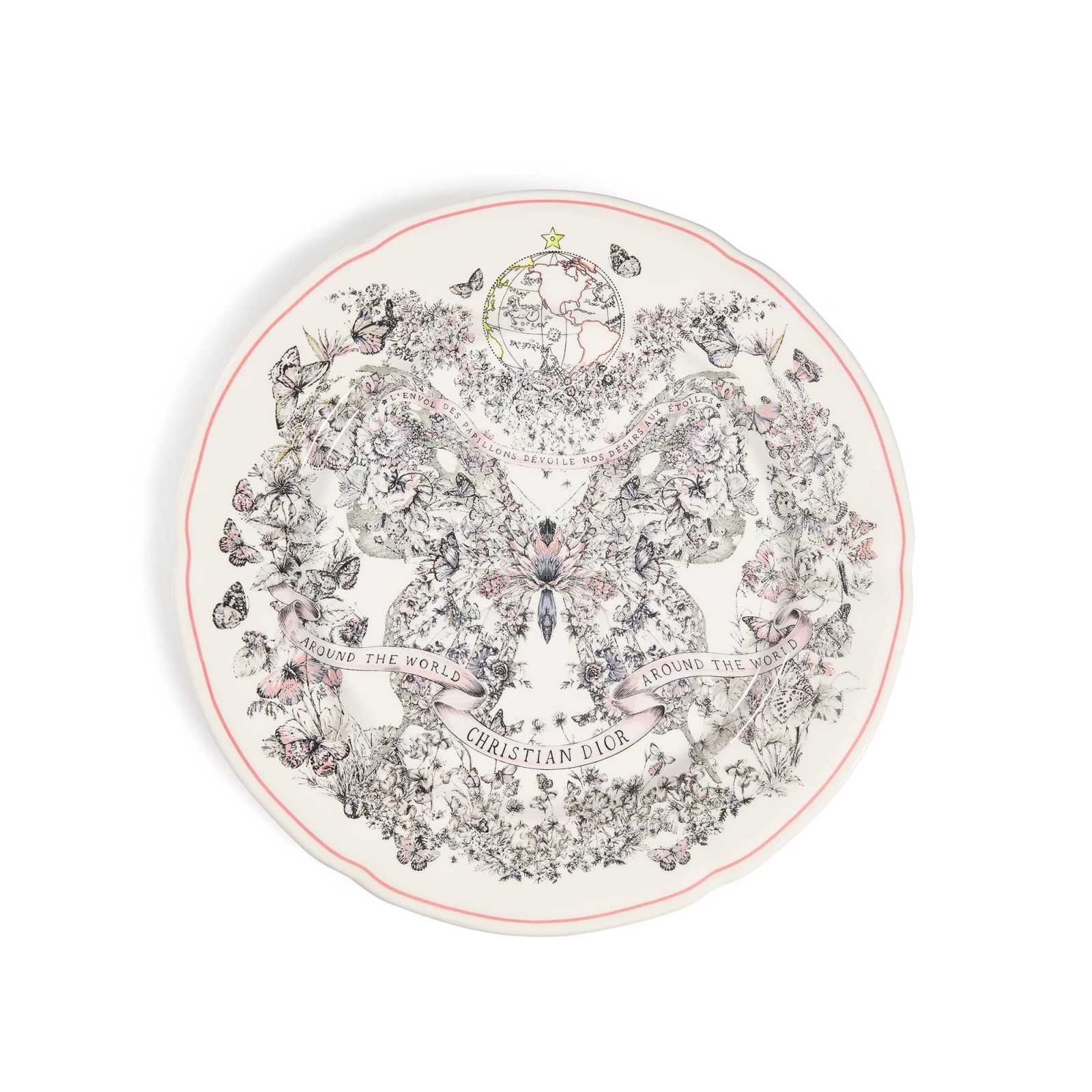 Nghệ sĩ thị giác người Ý Pietro Ruffo đã kết hợp sự tái hiện của chất liệu biểu tượng nhà Dior: toile de Jouy, những hoạ tiết cánh bướm sải sống động trên dãy đồ sành sứ với các màu xanh lá cây, xanh dương và đỏ.