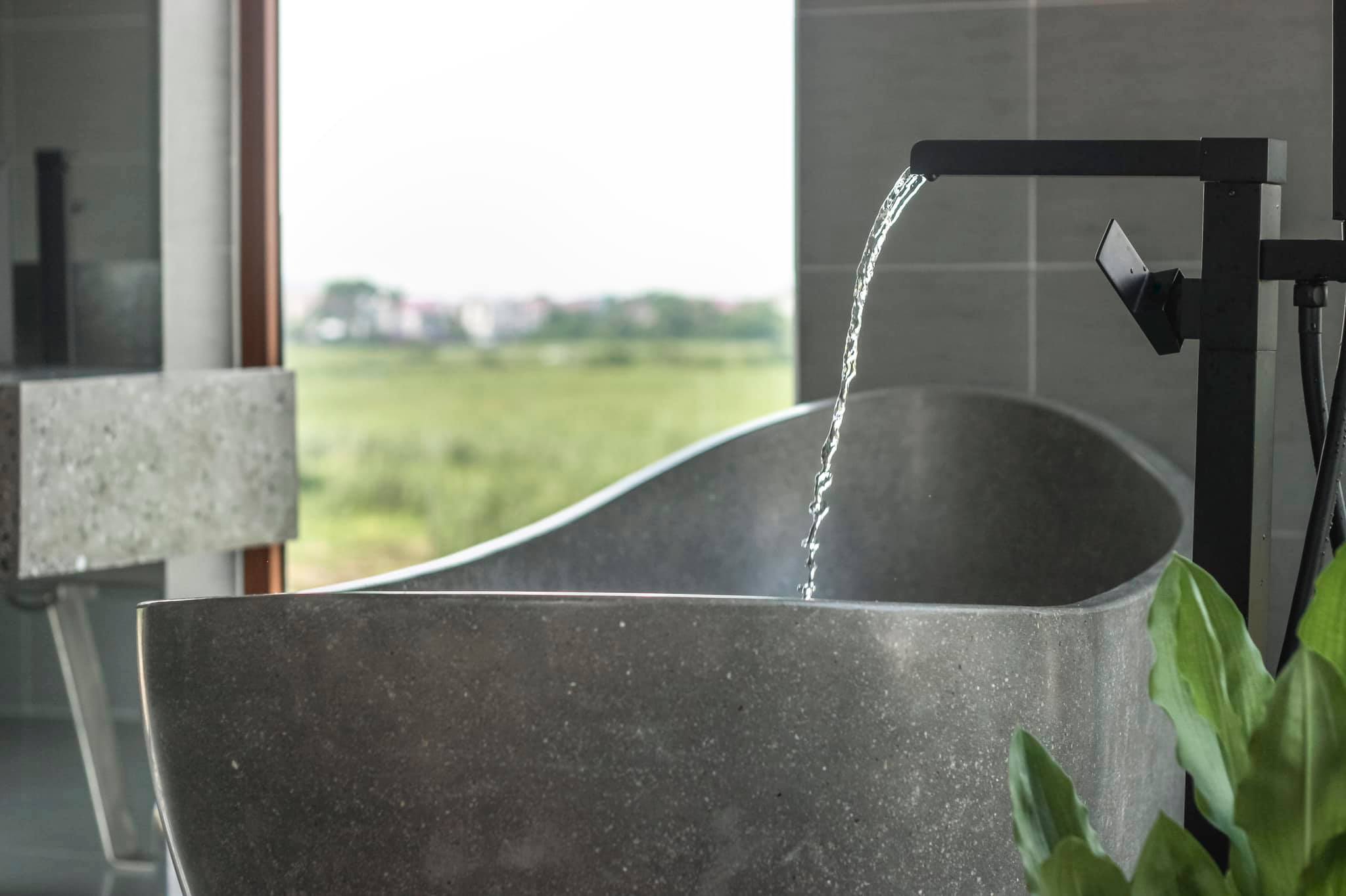 Mái lớn đổ bê tông dốc 27 độ, và một lớp bê tông chống nóng, sau đó lát đá. Về bản chất, độ dốc mái giúp thoát nước thoải mái và đơn giản. Ở cuối mái, KTS bố trí khe thu nước và đặt chiếc chum ở sân đúng vị trí nước chảy xuống. Dưới đáy chum này là ga thu nước.