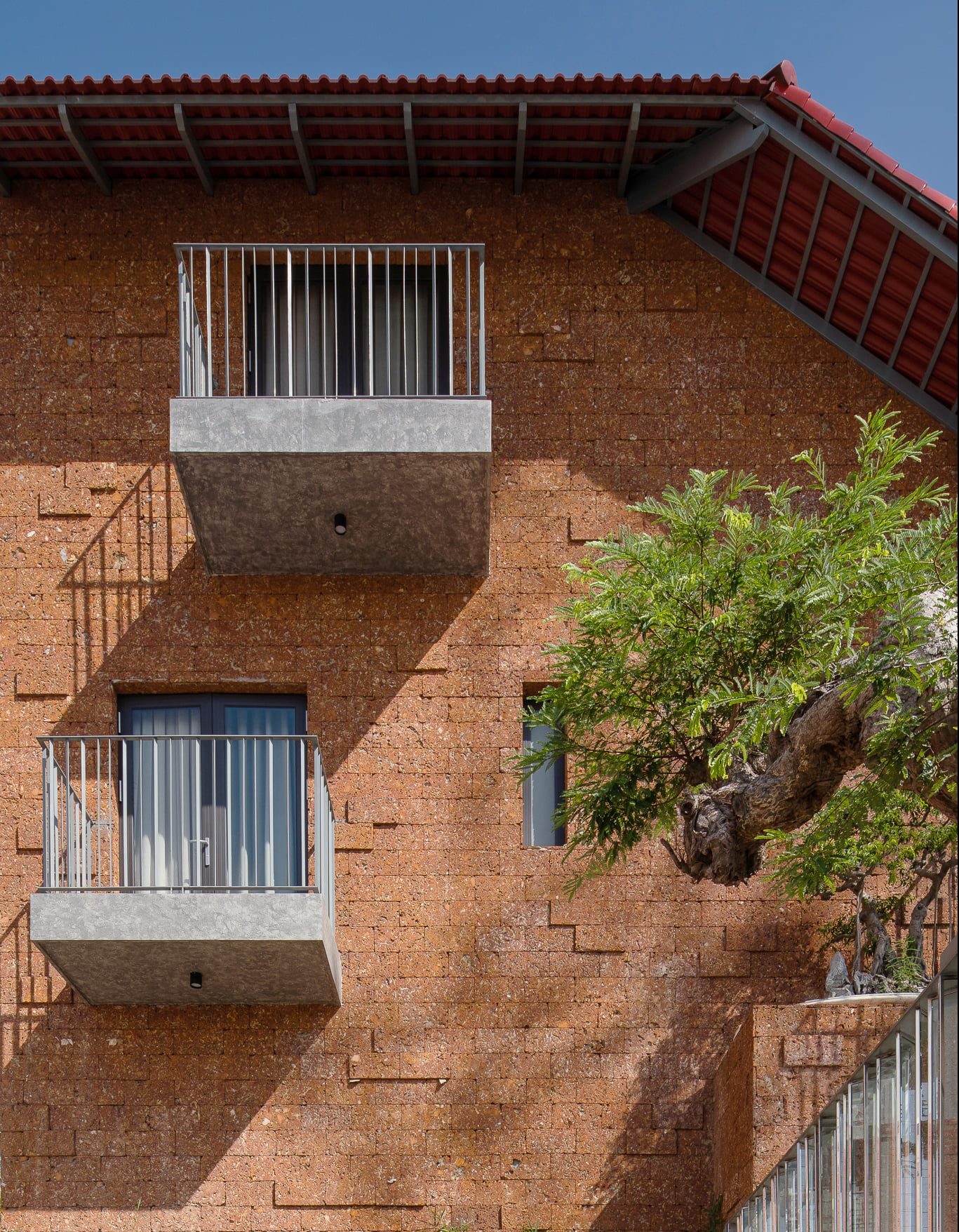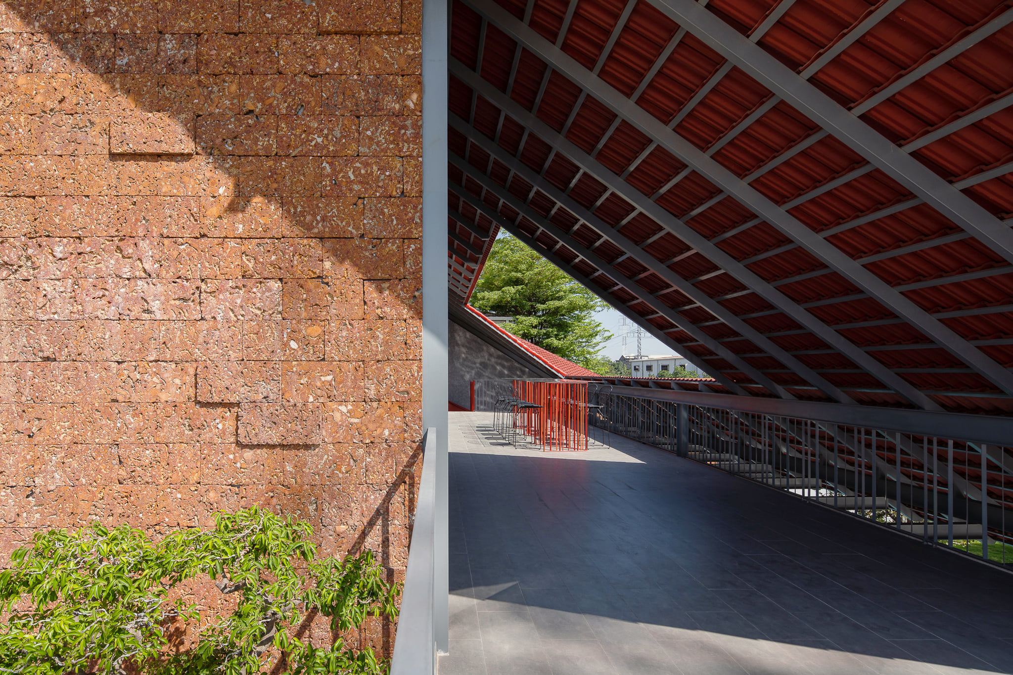 Mái ngói gấp kết nối hai phần này làm giảm chiều cao xây dựng, chắn nắng hướng đông, hướng các không gian ra sân vườn và hồ bơi. Toàn bộ ngoại thất được ốp đá ong kết hợp với mái ngói truyền thống giúp công trình thẩm mỹ và bền vững.