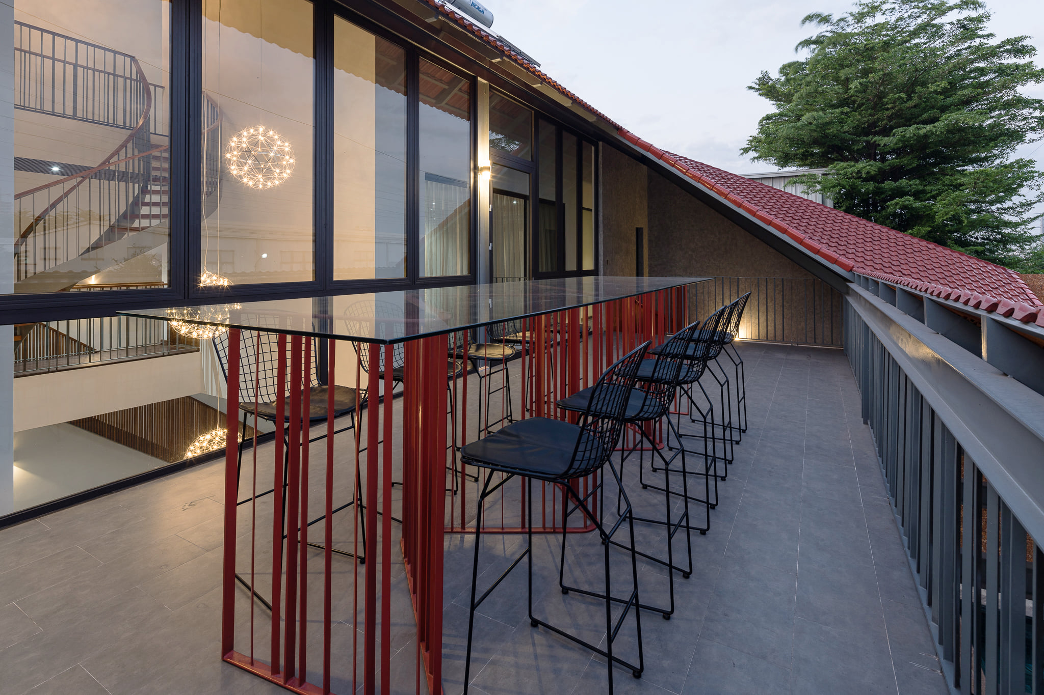 Nằm trong khuôn viên cây xanh bao gồm các chức năng như biệt thự, khu giải trí, sân tennis, khối nhà canteen, hồ bơi, cảnh quan sân vườn,… Roof Folding House (Nhà Mái Gấp) được MDA Architecture thiết kế dựa trên hai phần chính: phần xây dựng cố định là khối nhà chính và phần xây dựng nhẹ là hàng hiên.