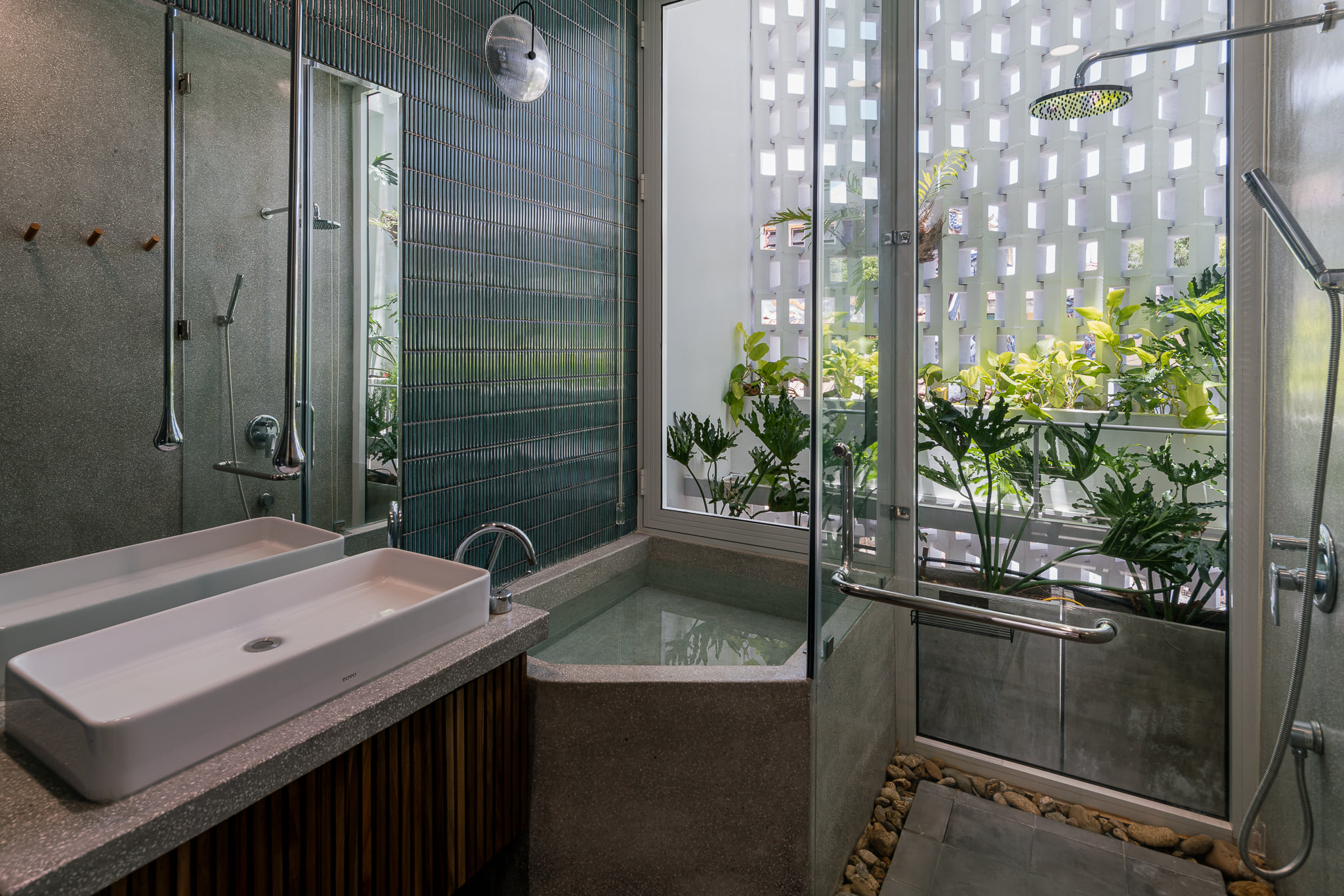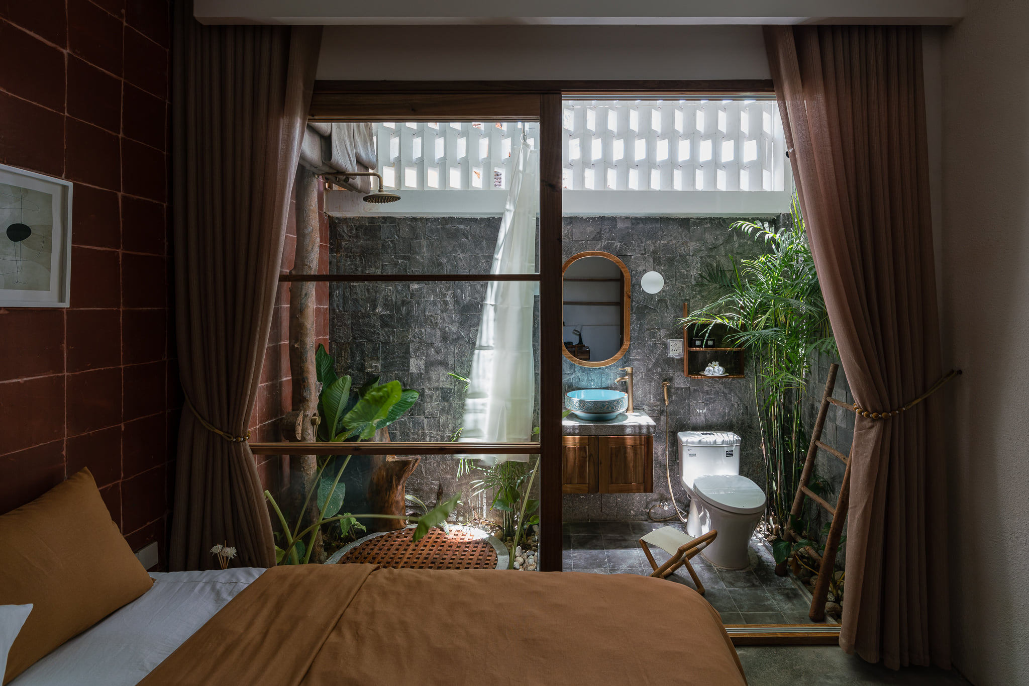 Ở ngôi nhà nhỏ này, ở đâu, bạn cũng có thể thấy cây xanh. Từ phòng tắm, phòng bếp, đến phòng ngủ. Đặc biệt ở phòng ngủ, cây xanh ngăn cách với sinh hoạt của con người qua cửa kính, từ đó mang đến giây phút thư giãn hòa vào thiên nhiên.