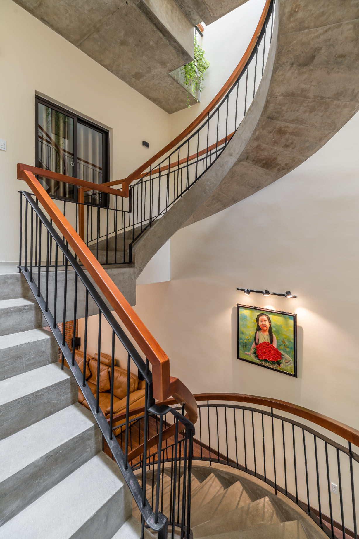 Đội ngũ KTS đã cố gắng lấy ánh sáng mặt trời từ trên xuống thông qua một “cái phễu” ở giữa nhà. Cầu thang được bố trí không đồng trục nhằm điều tiết ánh sáng xuống không gian bên dưới và giảm cảm giác về chiều cao. Studio cũng đã làm điều tương tự này với mặt trước.