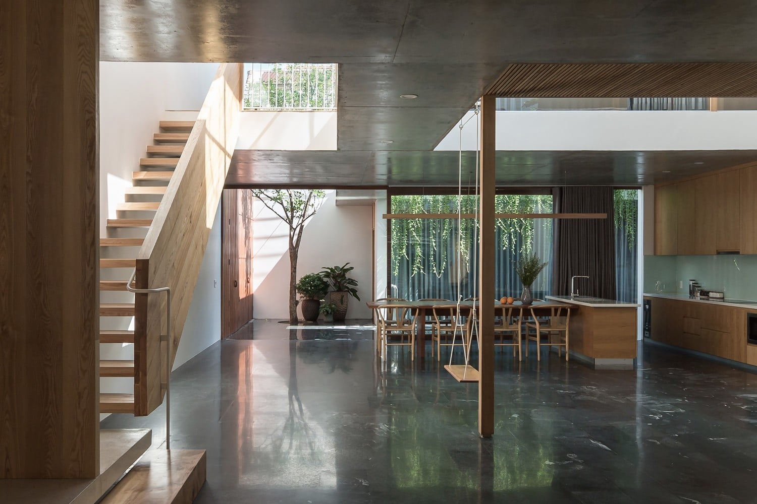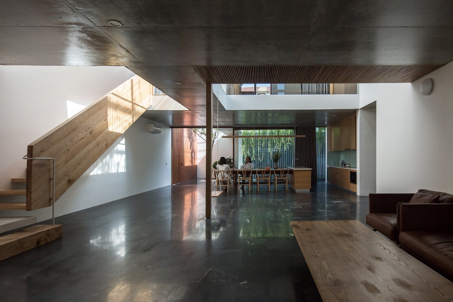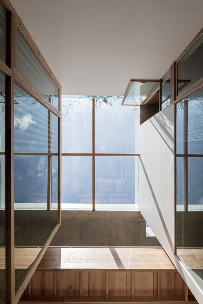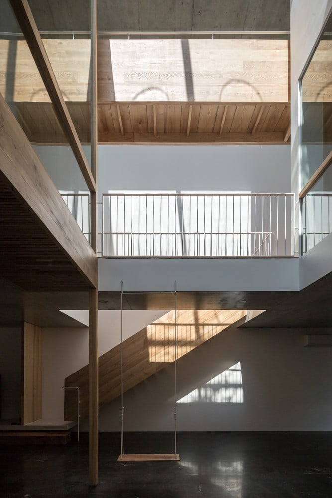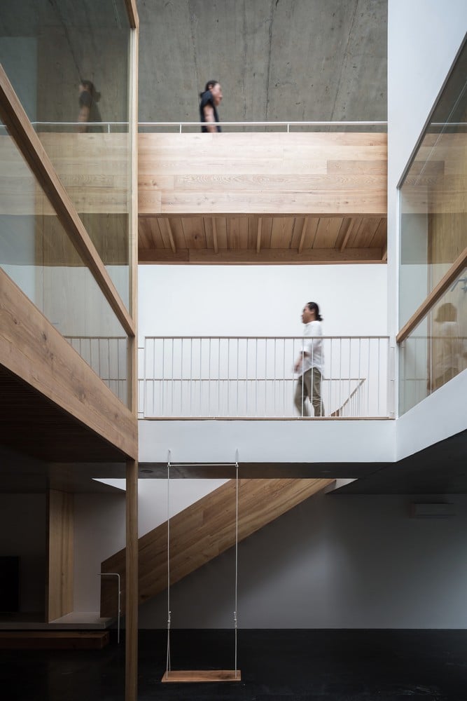 Bên trong, studio sử dụng kết cấu gỗ để lưu thông chính từ tầng 2 lên tầng 3. Sự kết hợp giữa cấu trúc gỗ và màu gỗ sồi tự nhiên mang đến cho ngôi nhà bầu không khí thư giãn, ấm áp, giảm bớt nặng nề của lớp vỏ bê tông. Điều này cũng thể hiện các kỹ thuật chế tác gỗ tiên tiến từ những người thợ thủ công thông qua các chi tiết lắp ráp điển hình trong cấu trúc bằng gỗ.