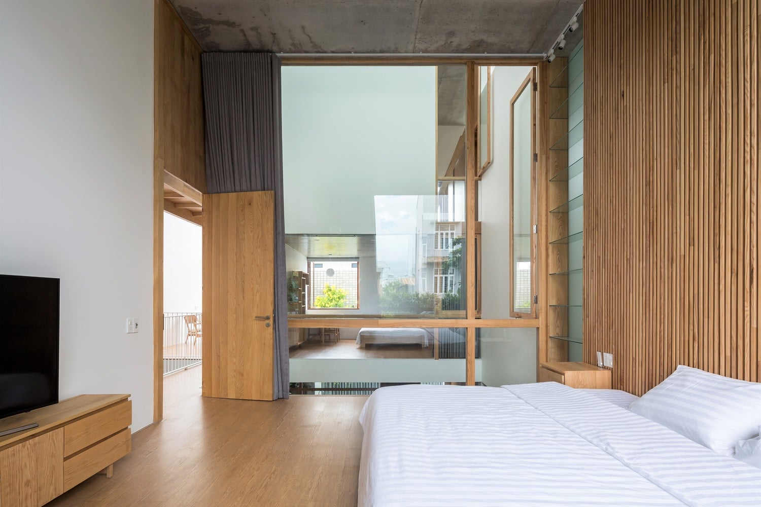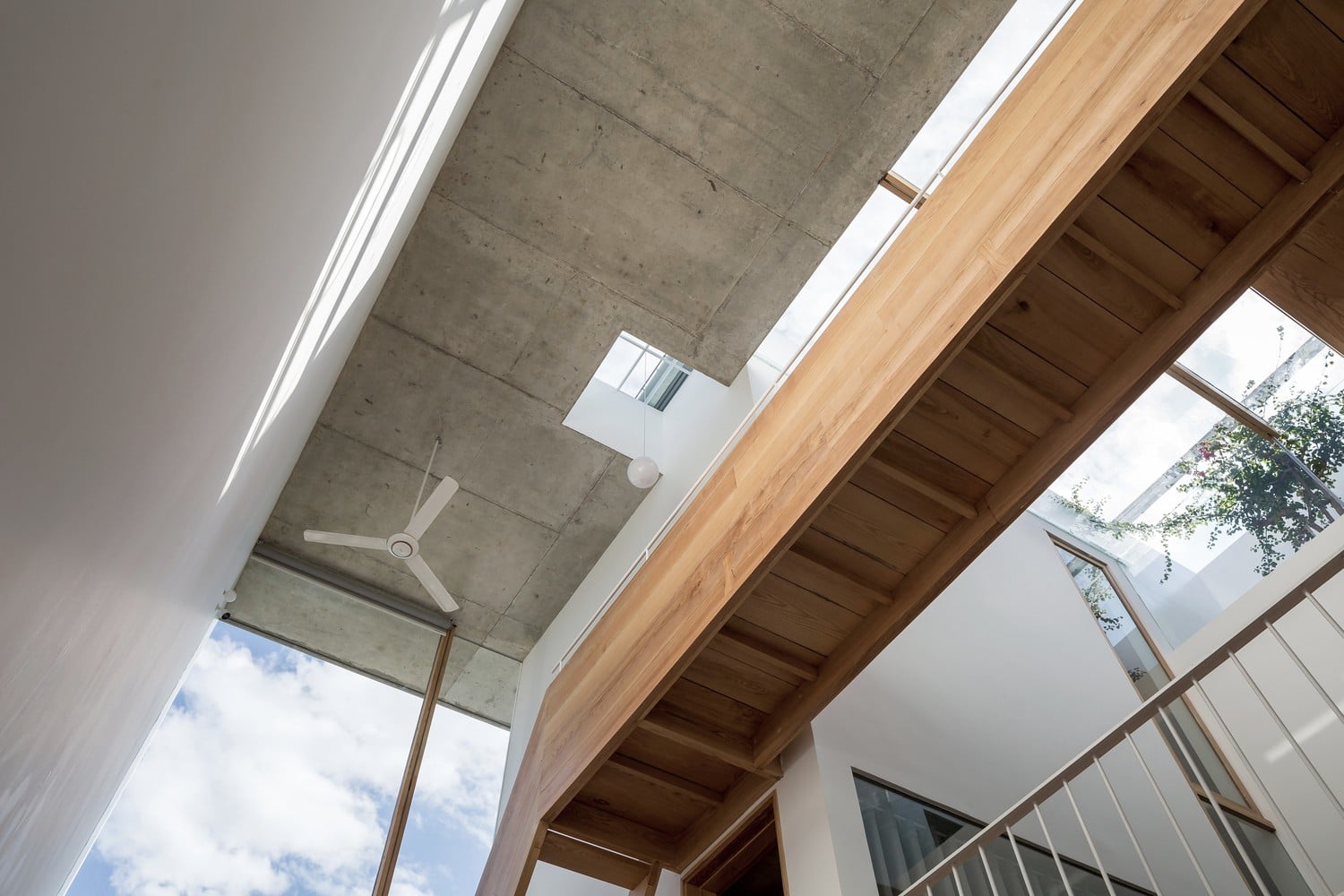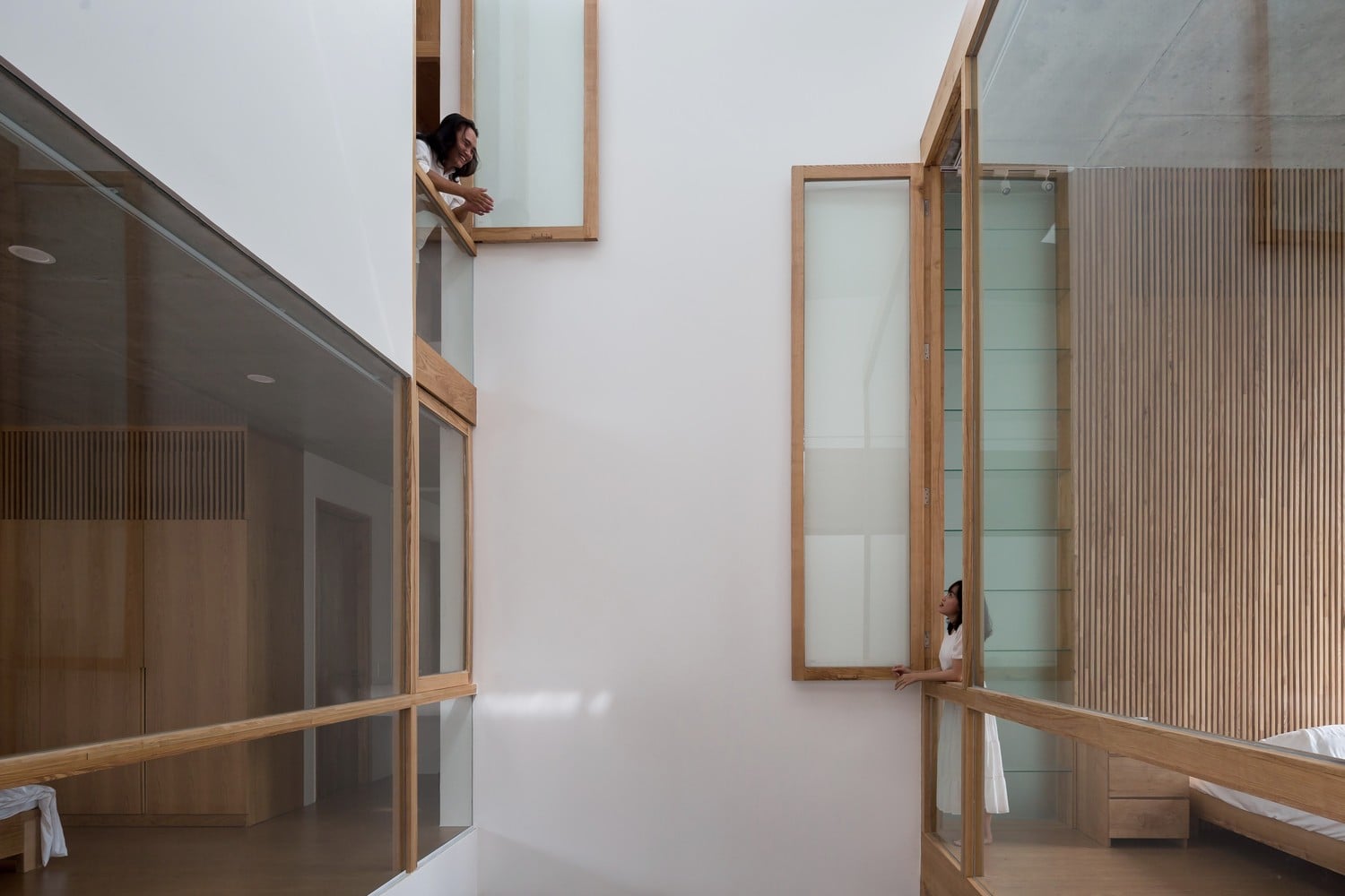 Bên trong, studio sử dụng kết cấu gỗ để lưu thông chính từ tầng 2 lên tầng 3. Sự kết hợp giữa cấu trúc gỗ và màu gỗ sồi tự nhiên mang đến cho ngôi nhà bầu không khí thư giãn, ấm áp, giảm bớt nặng nề của lớp vỏ bê tông. Điều này cũng thể hiện các kỹ thuật chế tác gỗ tiên tiến từ những người thợ thủ công thông qua các chi tiết lắp ráp điển hình trong cấu trúc bằng gỗ.
