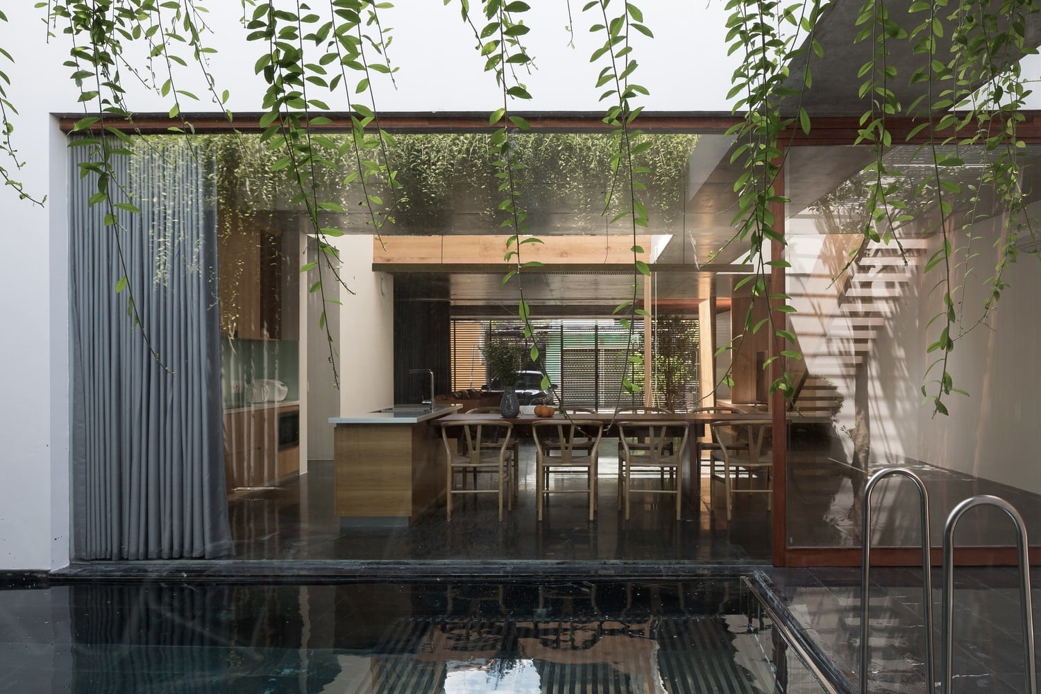 Từ đây, đội ngũ kiến trúc sư không chỉ bố trí và phân chia các không gian sống trong khoảng trống mà còn vận dụng được sự tối ưu và thông gió qua các khoảng trống, lấy ánh sáng tự nhiên vào nhà bằng cách tạo khoảng đệm tự nhiên từ bể bơi, cây xanh và sân vườn.