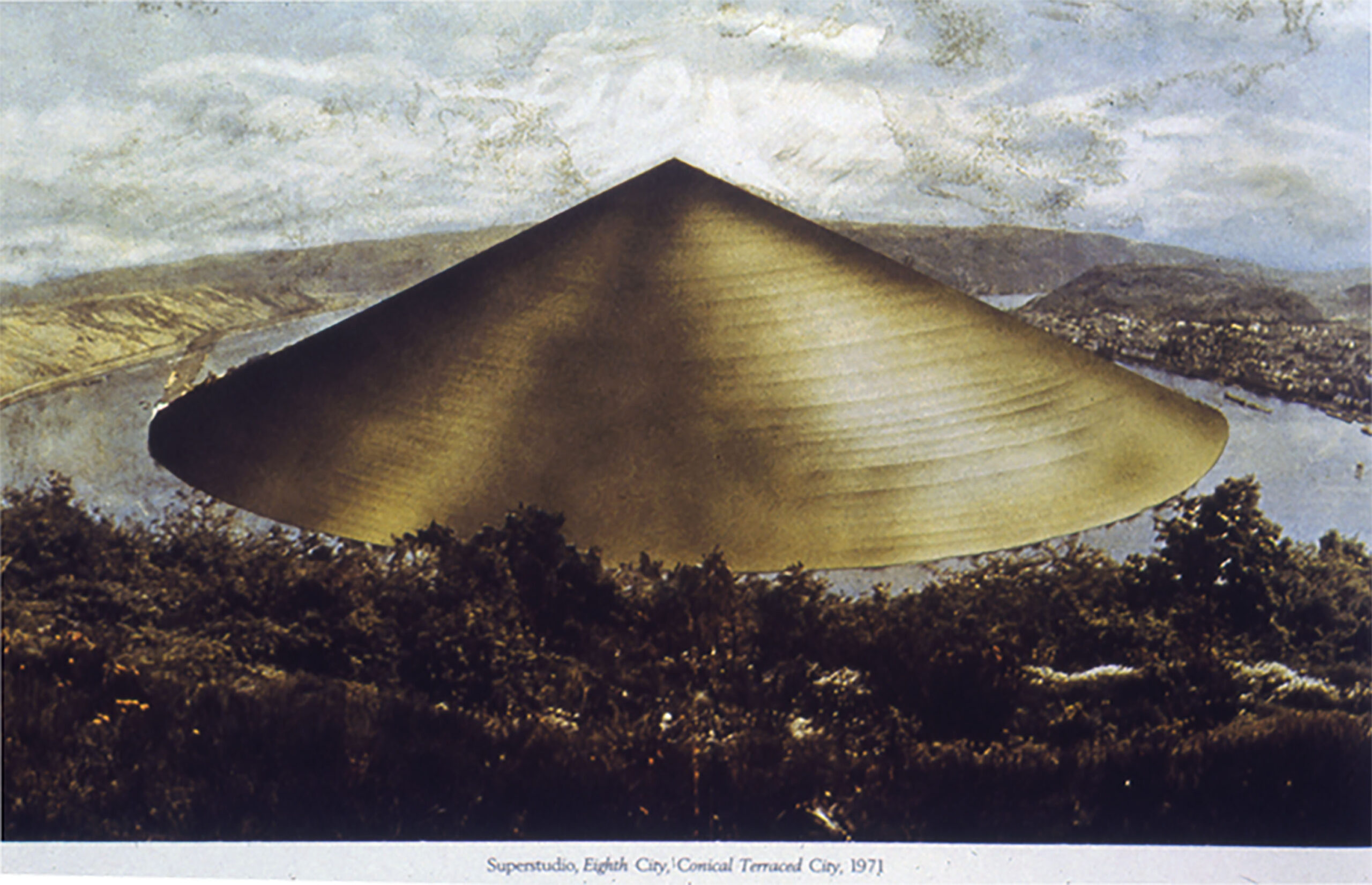 “Thành phố thứ tám, thành phố hình nón bậc thang” trong dự án Mười hai Thành phố Lý tưởng, do Superstudio thực hiện. Ảnh: Internet Archive