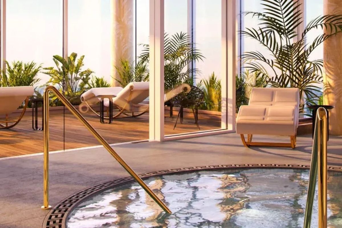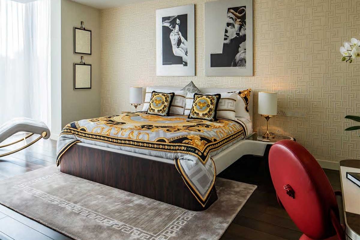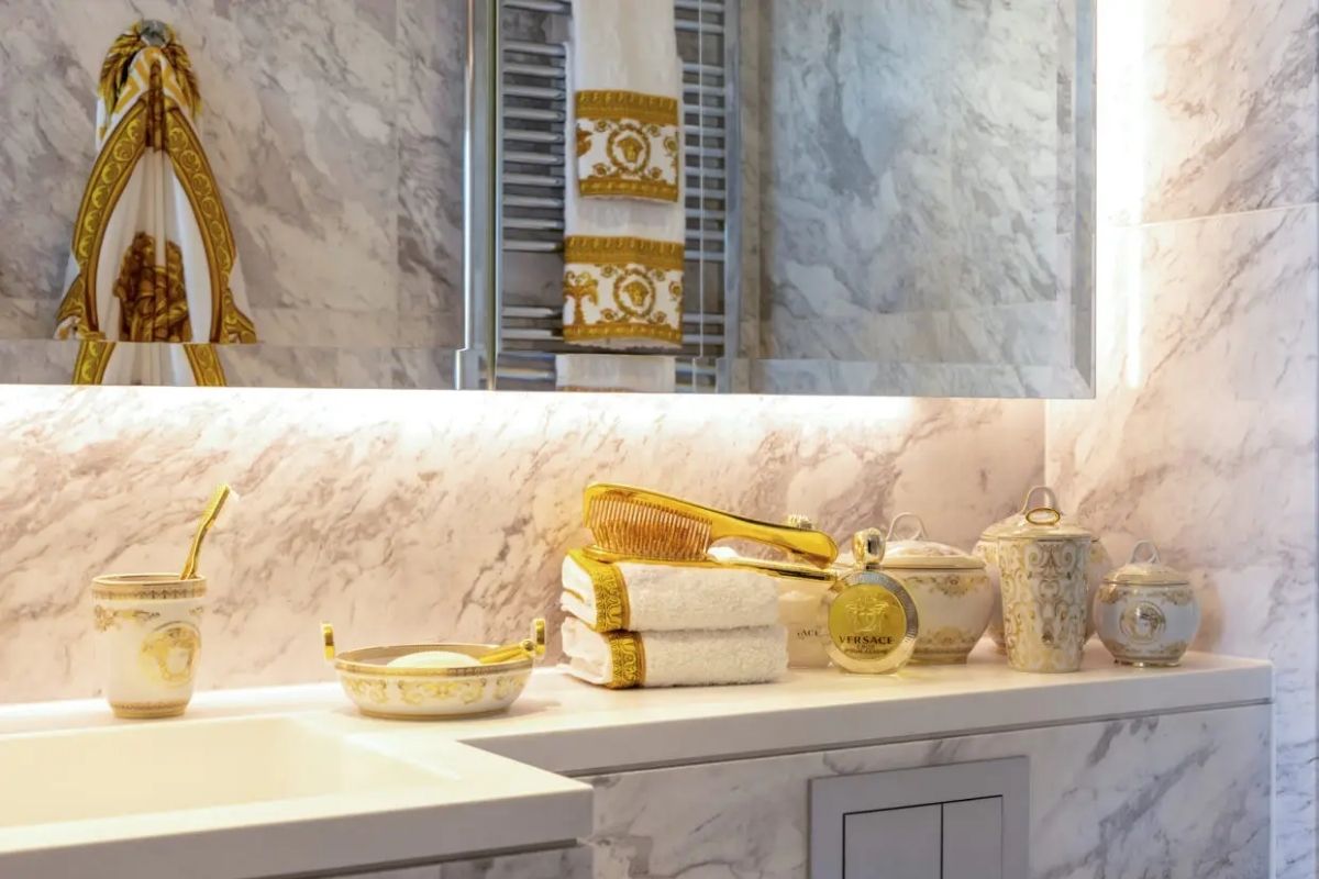 Bên trong, toàn bộ không gian sống được thiết kế độc quyền bởi Versace Home, dưới sự giám sát sáng tạo trực tiếp của Donatella Versace. Nội thất nơi đây là sự hòa quyện tinh tế giữa hiện đại và cổ điển, giữa đường nét thủ công tinh xảo và phong cách xa hoa đặc trưng. Biểu tượng Medusa và họa tiết Greek Key – dấu ấn kinh điển của Versace xuất hiện từ gạch mosaic, tường trang trí, sàn khảm cho đến khu spa và hồ bơi.