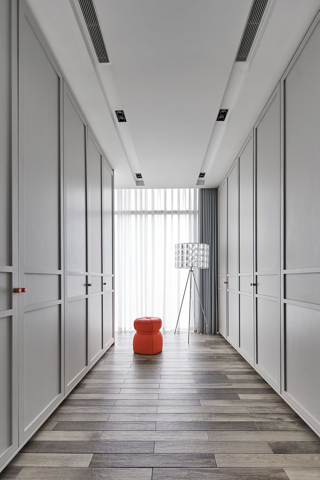 Phong cách Haussmann của Paris được chú ý khai thác nhằm thỏa mãn mong muốn của chủ nhân về một ngôi nhà sang trọng vượt thời gian. Ấn tượng thị giác bắt đầu từ sàn nhà xuống hành lang phòng ngủ, nổi bật với những bức tường trắng khiến màu sàn trở nên ấn tượng hơn. Hàng bóng đèn thủy tinh được trang trí trên trần khiến gian phòng cuốn hút và trang nhã hơn bao giờ hết.
