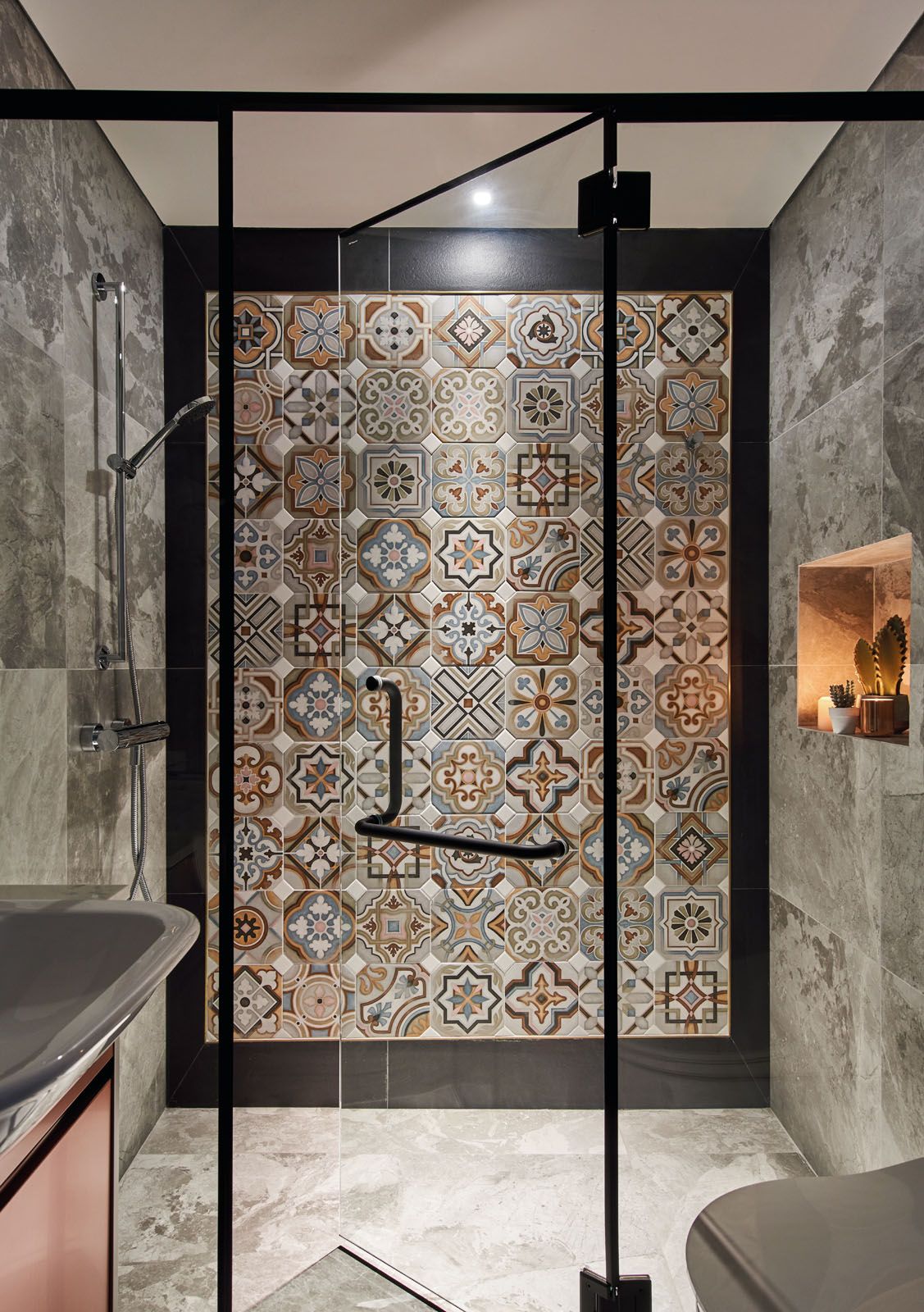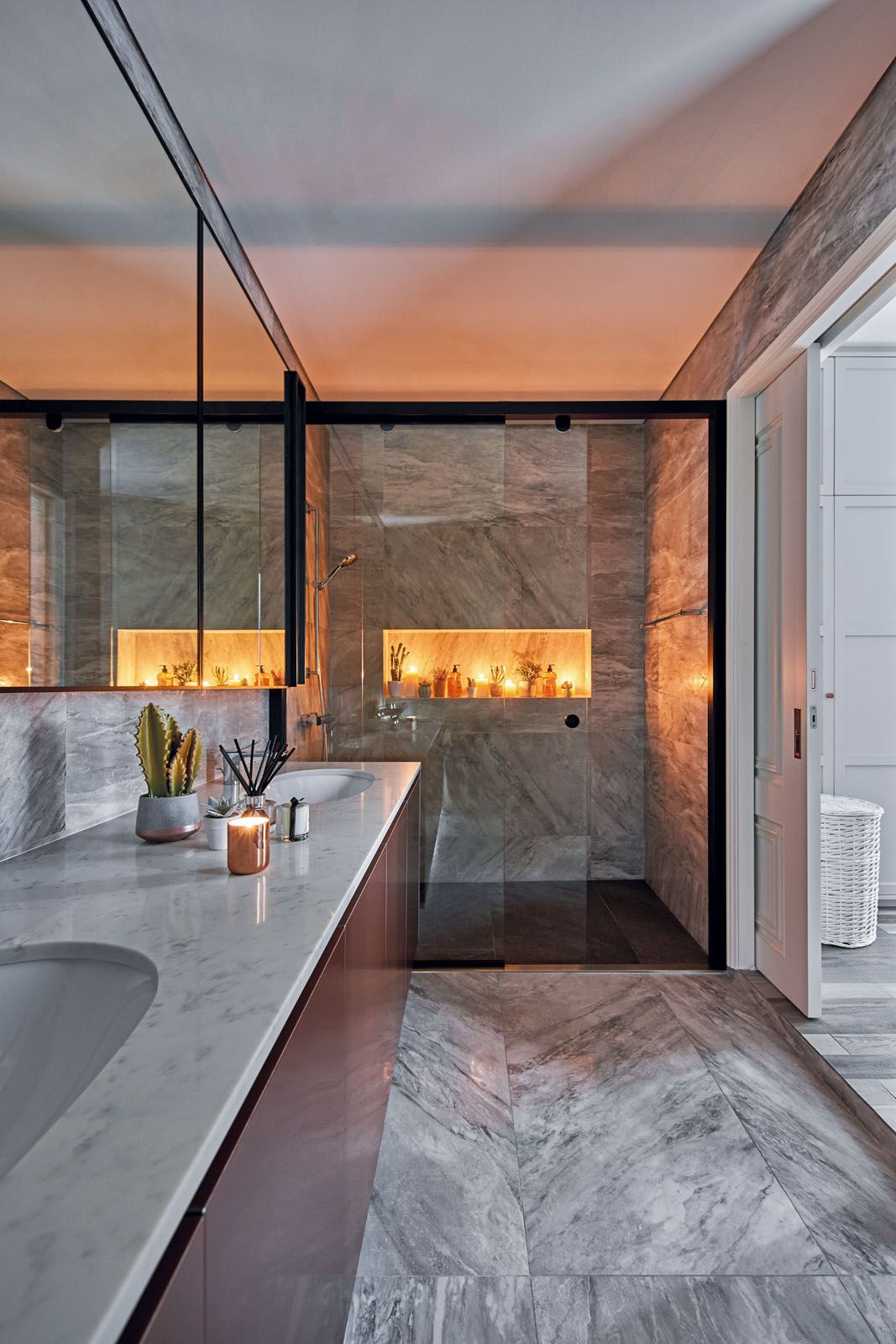 Nha tắm nổi bật với những bức tường bằng đá cẩm thạch lớn màu xám với hoa văn mang vẻ tự nhiên hoang dã. Đối với phòng tắm nhỏ hơn, Ling sử dụng gạch có họa tiết gỗ đặt theo đường chéo. Hai loại gạch này vừa bổ trợ tính thẩm mỹ cho nhau, vừa tạo nên cảm giác thoải mái và đầy cảm hứng cho chủ nhân mỗi lần bước vào.