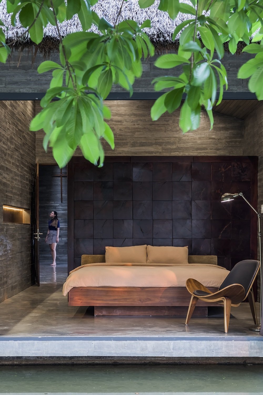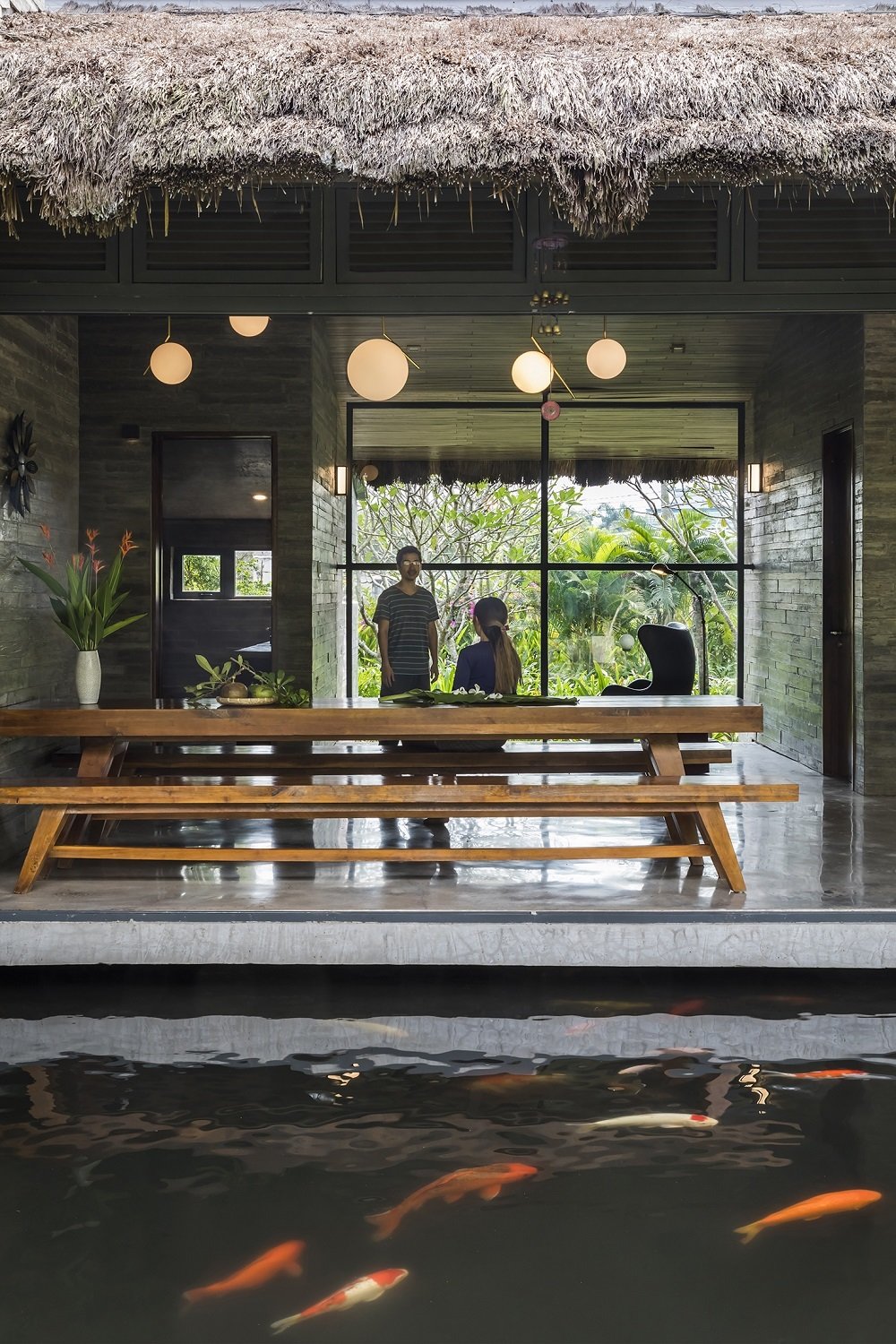 Hình dung một chốn trở về đầy an nhiên, 3 kiến trúc sư quyết định bố trí ngôi nhà cạnh hồ nước, mang đến tầm nhìn bao quát và giảm nhiệt vào ban ngày, mát mẻ vào ban đêm. Dinh thự gồm 5 khối nhà riêng biệt, bố trí dưới mái tranh dày. Mỗi khối mang đến hướng nhìn độc đáo vào các không gian khác trong nhà cũng như cảnh quan bên ngoài. Vị trí và cấu trúc mang làn gió tự nhiên mát lành cùng ánh nắng ấm áp vào trong từng ngóc ngách.