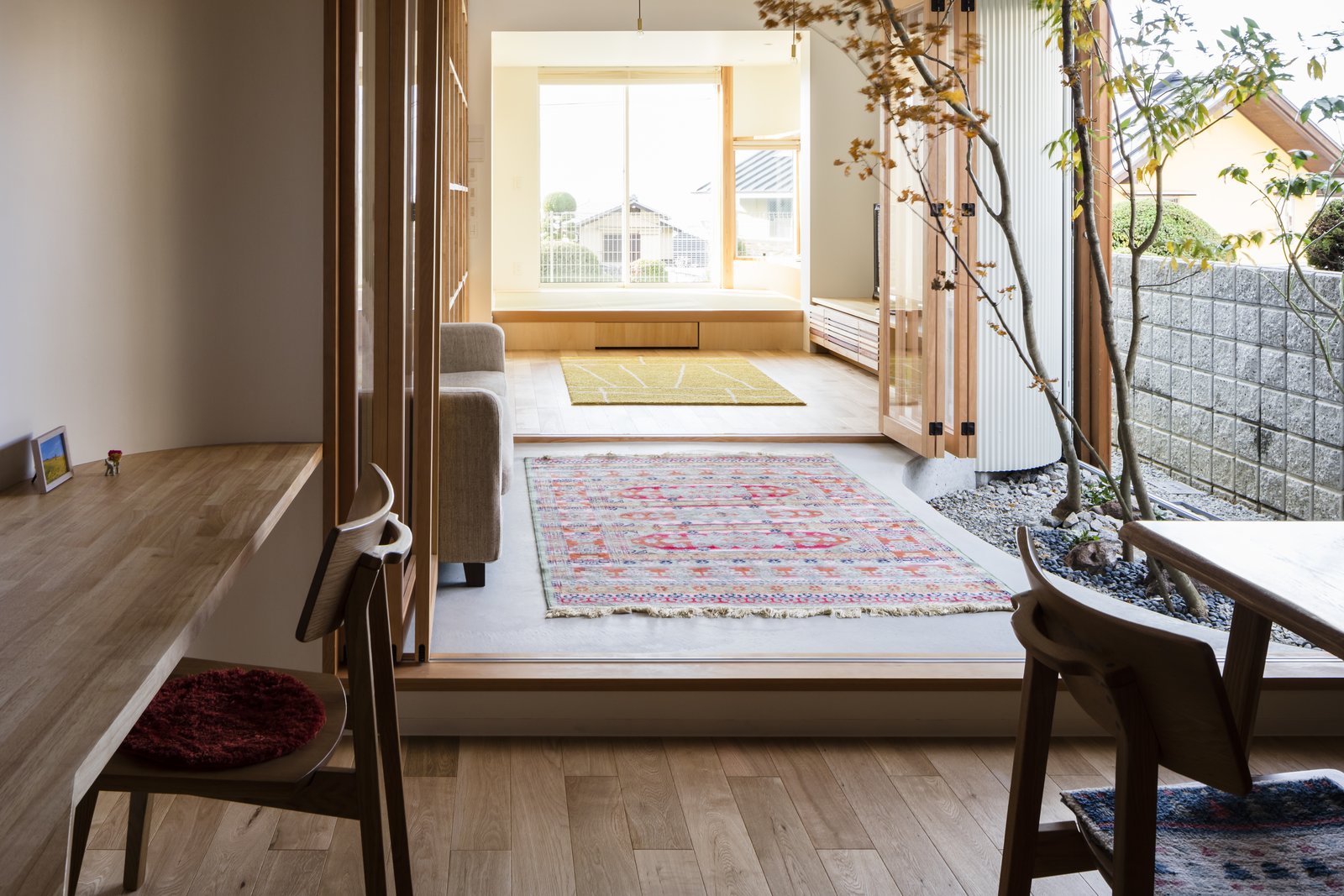 Sân nối hai cánh của ngôi nhà. Công trình nổi bật với phòng kiểu Nhật truyền thống với phòng khách cao gấp đôi và gác xép ở trên tầng mái. Ngoài ra còn có thêm hai phòng ngủ, hai phòng tắm, nhà bếp mở và phòng ăn.