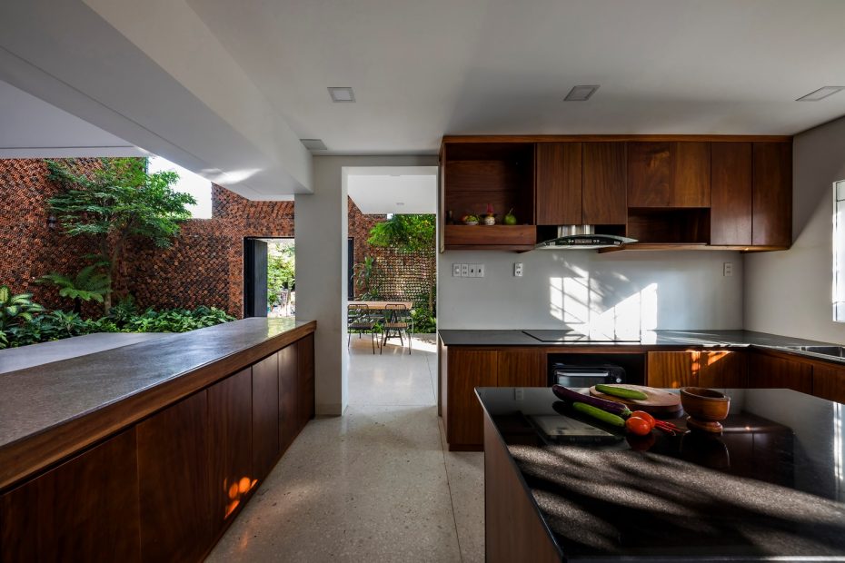 Ngôi nhà vẫn có thể duy trì nếp sống cũ của các thành viên trong gia đình nhưng tạo ra nhiều không gian chung hơn, giúp mọi người dễ dàng nhìn thấy nhau đồng thời tăng sự kết nối. Không gian học chung ở tầng trên hướng ra thông tầng, kết nối với “khu vườn” bên dưới, nơi ông nằm võng, bà loay hoay trong bếp, mấy đứa nhỏ chơi đùa. Tất cả các sinh hoạt hằng ngày diễn ra bình yên dưới tán cây.