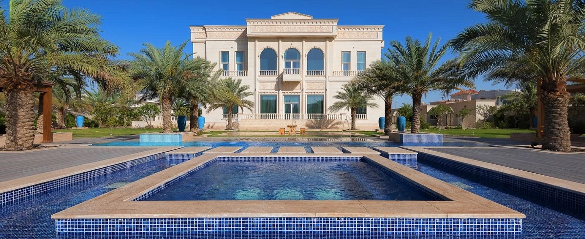 Không có lý do gì bạn không yêu ngay từ cái nhìn đầu tiên với những biệt thự hùng vĩ này ở Dubai. Mặt tiền của ngôi biệt thự trang nghiêm, bề thế như một cung điện hoàng gia. Bước vào bên trong, mỗi phòng đều trông giống như một kiệt tác kiến trúc được chạm khắc tinh xảo. Những cây xanh lạ mắt và hoàn thiện công phu đến từng ngóc ngách. Cửa sổ có mái vòm lớn và các cột trang trí mang hơi hướng châu Âu. Sàn nhà bằng đá cẩm thạch sáng được trang trí lộng lẫy tôn lên trần nhà rộng. Có một rạp hát trong nhà với chỗ ngồi sang trọng để giải trí. Biệt thự có sáu phòng ngủ và chín phòng tắm.