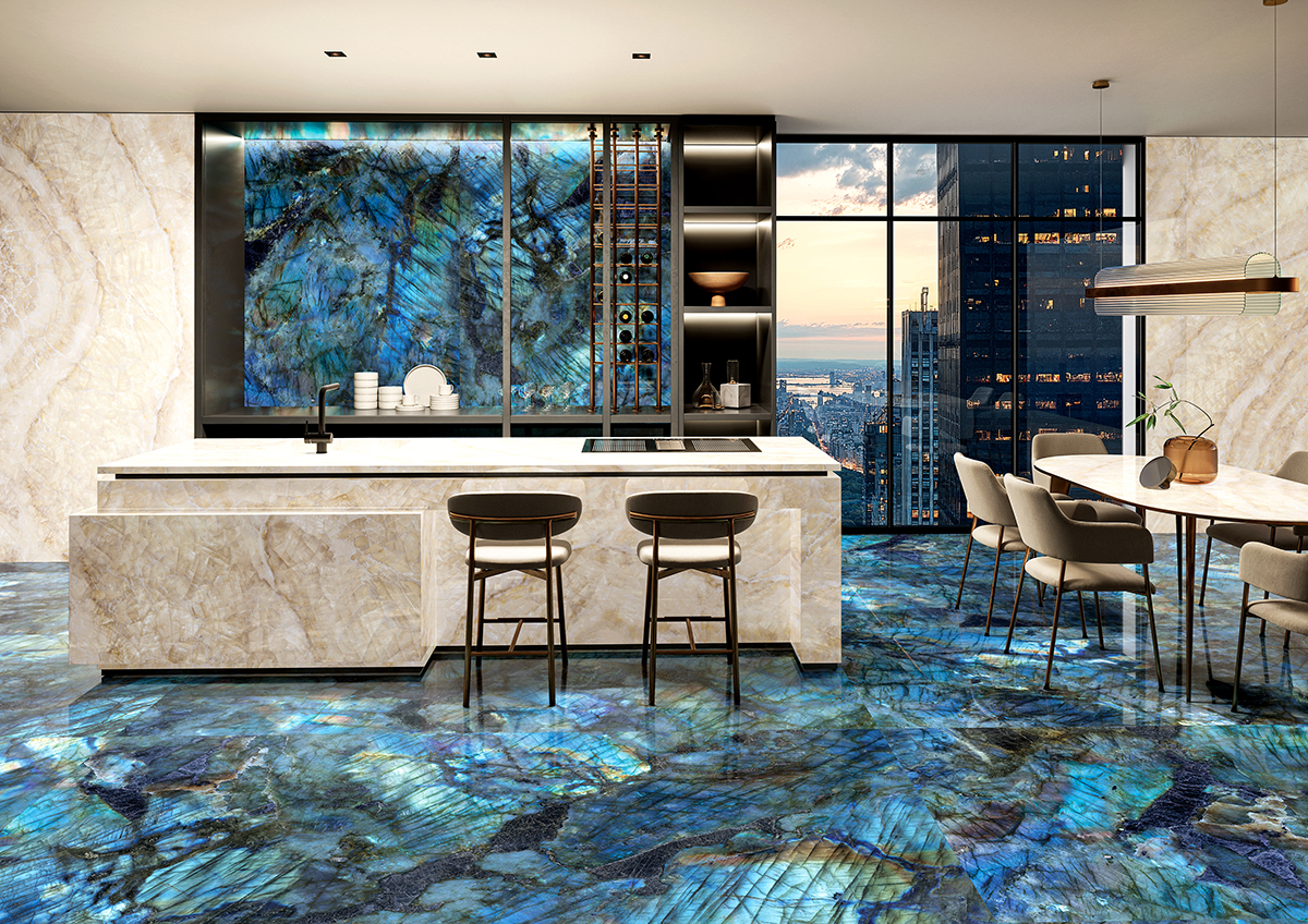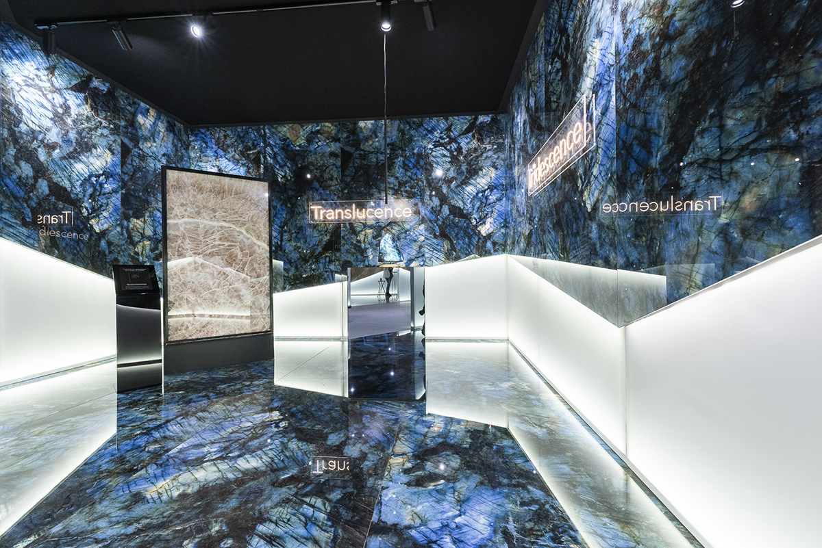 Tele di Marmo Lumia mang vẻ đẹp chân thật của đá xà cừ (Labradorite), là tâm điểm nổi bật tại Salone del Mobile.