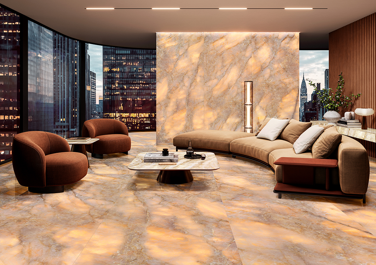 Phòng khách sang trọng khi ốp gạch hiệu ứng ánh sáng lấy cảm hứng từ đá Hổ Phách.