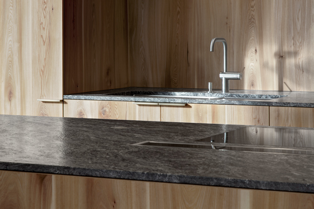 Chi tiết tủ bếp gỗ Du với mặt đá Gneiss Passeirer. Ảnh Gustav Willeit