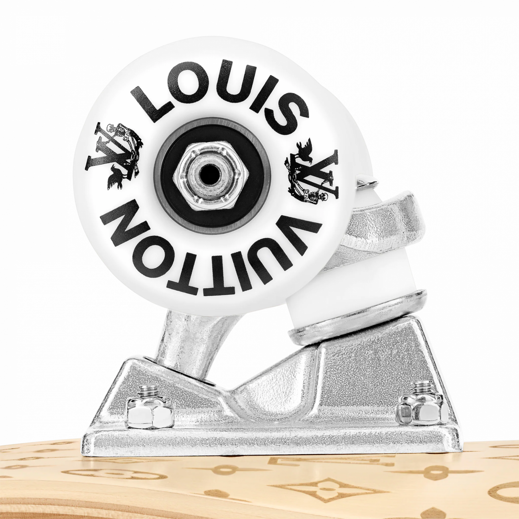 Trên bánh xe của ván trượt mùa này có khắc logo Louis Vuitton, phù hiệu trên bánh xe, đinh vít hoa monogram… những biểu tượng của công ty xa xỉ phẩm Pháp.
