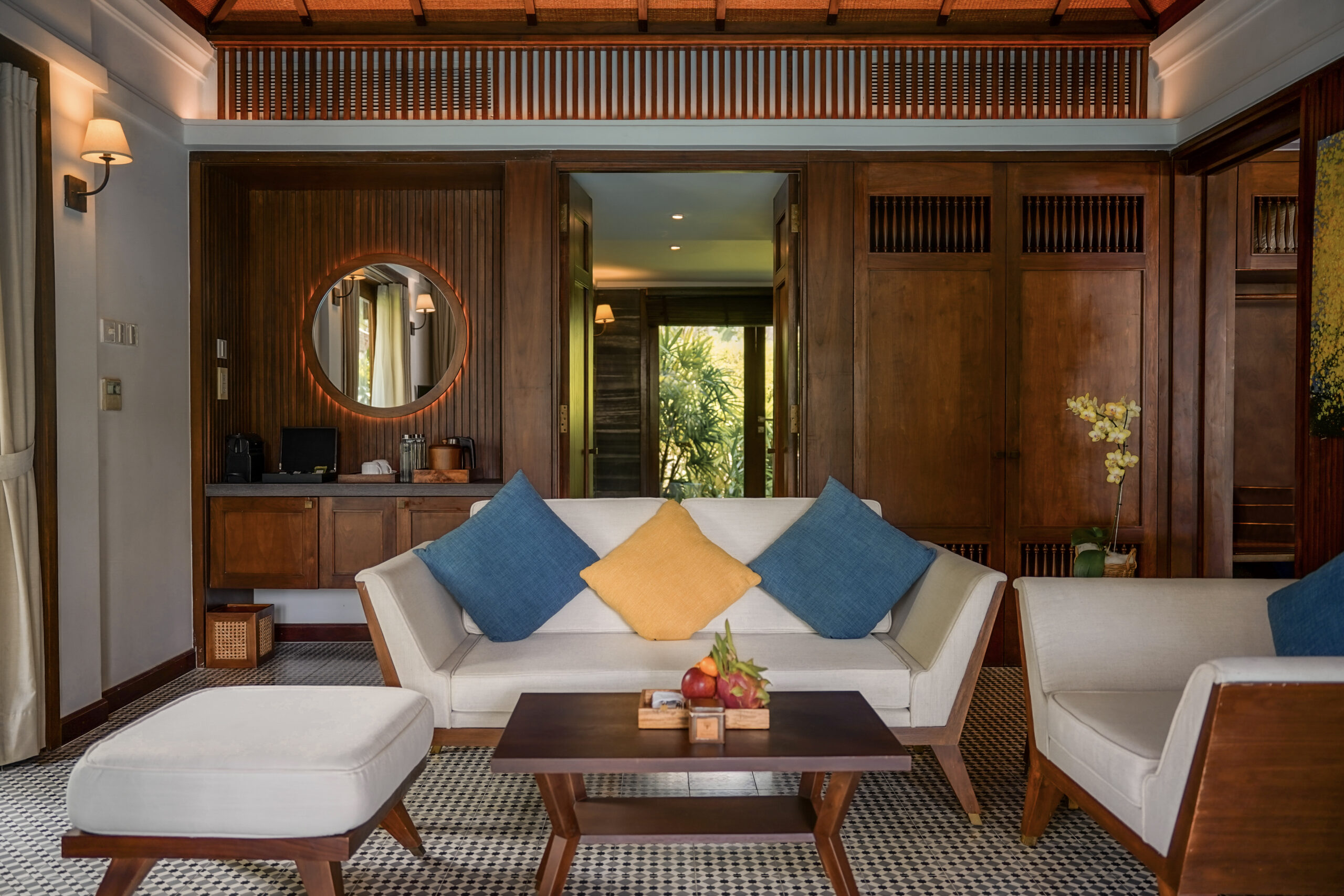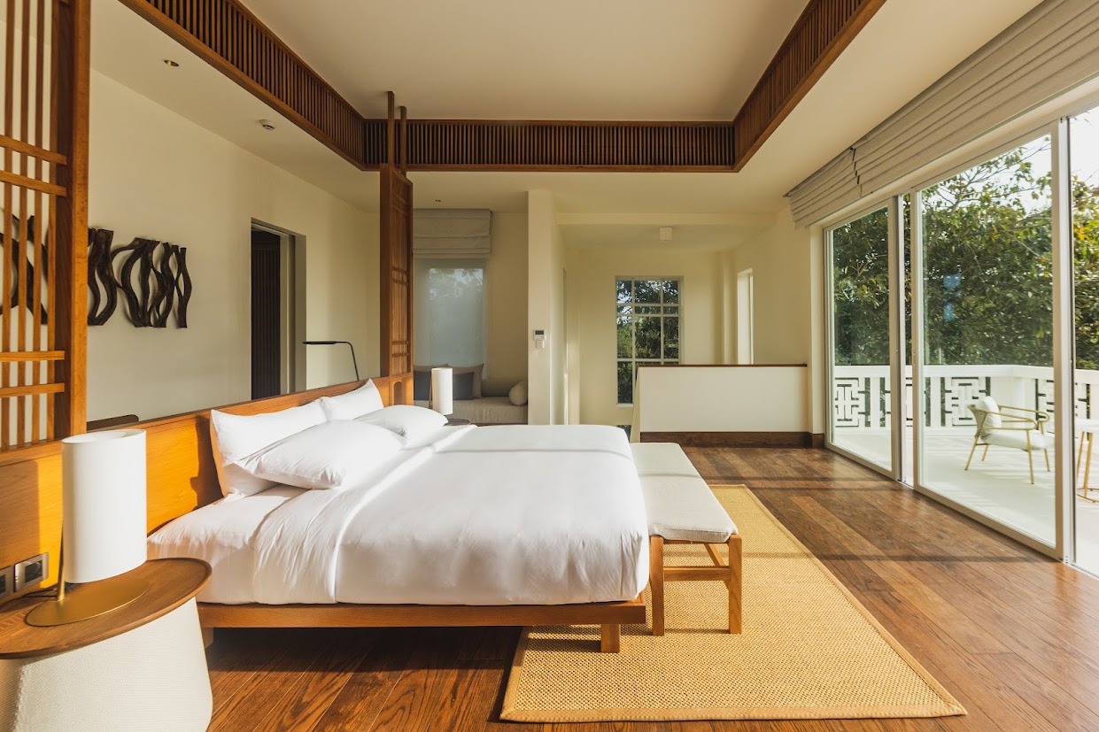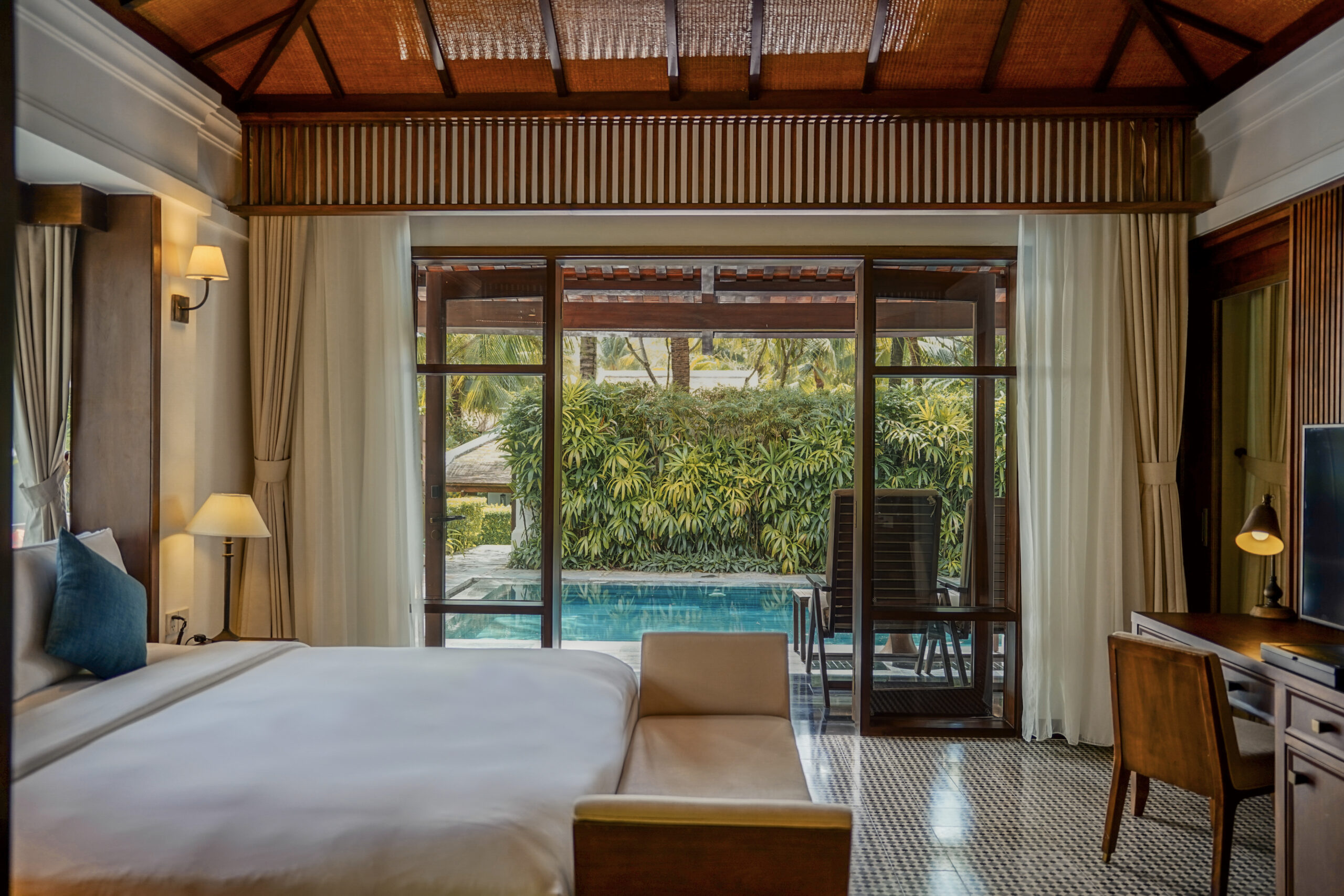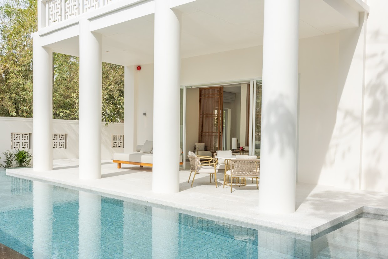 Với diện tích lên đến 260m2, mỗi biệt thự gồm ba phòng ngủ được thiết kế với cửa kính từ sàn đến trần, cho phép tận hưởng vẻ đẹp không giới hạn của đại dương. Phong cách kiến trúc truyền thống Huế, kết hợp với nội thất sang trọng và tinh tế với những tác phẩm nghệ thuật độc đáo, tạo nên không gian nghỉ dưỡng đầy mê hoặc. Điểm đặc biệt của mỗi biệt thự là hồ bơi vô cực ngoài trời với nước ấm, mở ra một không gian thư giãn tuyệt vời, hướng tầm nhìn ra đại dương. Bên cạnh đó, bãi biển riêng dài 3km chỉ cách vài bước chân, là nơi lý tưởng để thư giãn và tận hưởng những khoảnh khắc bình yên giữa thiên nhiên tuyệt đẹp.