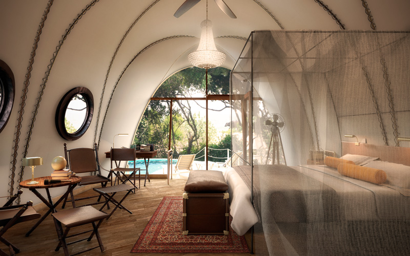 Mỗi lều trong số 28 lều của nó được thiết kế như một cấu trúc hình vòm, giống như những tảng đá và tảng đá gần đó, với bố cục có hình dạng như chân của một con báo. Các phòng nghỉ có bồn tắm bằng đồng thủ công độc đáo đến giường 4 cọc xa hoa đại diện cho thiết kế sáng tạo sang trọng và hiện đại của đoàn thám hiểm. Sàn nhà bằng gỗ tếch và tường bằng vải bạt pha trộn với các chi tiết bằng da tối màu của lều, trong khi phòng tắm thoáng mát có bàn trang điểm bằng đồng và bồn tắm bằng đồng thủ công.