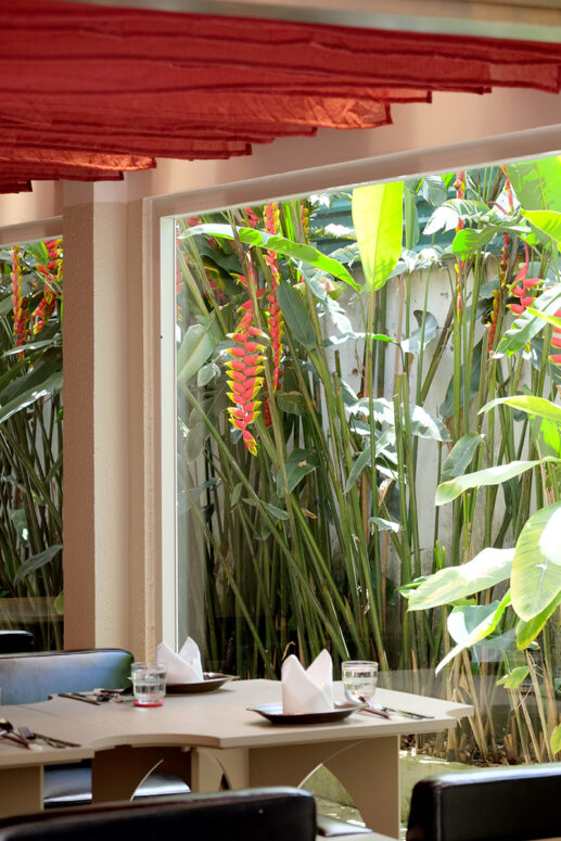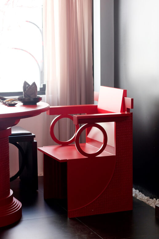 Về kiến trúc, nội thất và vật dụng, Aami phối hợp cùng L.A.D Atelier thiết kế và thi công toàn bộ, thể nghiệm định hướng “total design” cho dự án. Trên không gian hiện hữu của ngôi nhà thiết kế theo chủ nghĩa hiện đại thập niên 60-70, L.A.D đã tái sinh mặt bằng theo cách phân khu thành các hộp trải dài lần lượt mang tên: “Đền đài”, “Thông reo” và “Phong lụa”. Thiết kế được lấy cảm hứng từ kiến trúc và điêu khắc Đền-Tháp Champa, Biểu tượng và ngôn ngữ Đông Sơn… thể hiện ở hình khối của bàn, ghế, vách tường, ô cửa sổ, vật liệu của nền gạch, sắc màu của gỗ, lụa và ánh sáng có sự chuyển đổi về sắc từ đỏ qua cam đến vàng riêng biệt, đem lại tính đa diện cho sự thể nghiệm của các trường không gian nhỏ nằm trong lòng một chủ thể lớn.