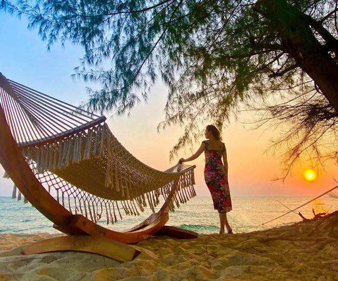 Không còn ồn ào phố thị, không còn giờ tan tầm kẹt xe nóng nực, buổi chiều bãi Ông Lang chỉ có tiếng sóng vỗ rì rào, làn gió mơn man để thả hồn phiêu lãng. Đã bao lâu rồi, bạn chưa đắm mình trong một chiều hoàng hôn yên bình đến thế?
