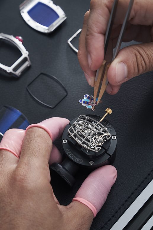 Các nghệ nhân tại Richard Mille đã mất hơn 6 tháng để tìm kiếm và chọn lọc các viên đá quý phù hợp nhất với thiết kế. “Làm việc với những viên đá quý nhiều màu thật sự là điều không hề dễ dàng. Lý do vì những viên đá mang trên mình gam màu khá tương tự nhau, nhưng chỉ cần người nghệ nhân thay đổi kích cỡ (carat) và phương pháp cắt, ngay lập tức sẽ khiến chúng trở nên khác hẳn so với ban đầu”, bà Cécile Guenat giải thích.