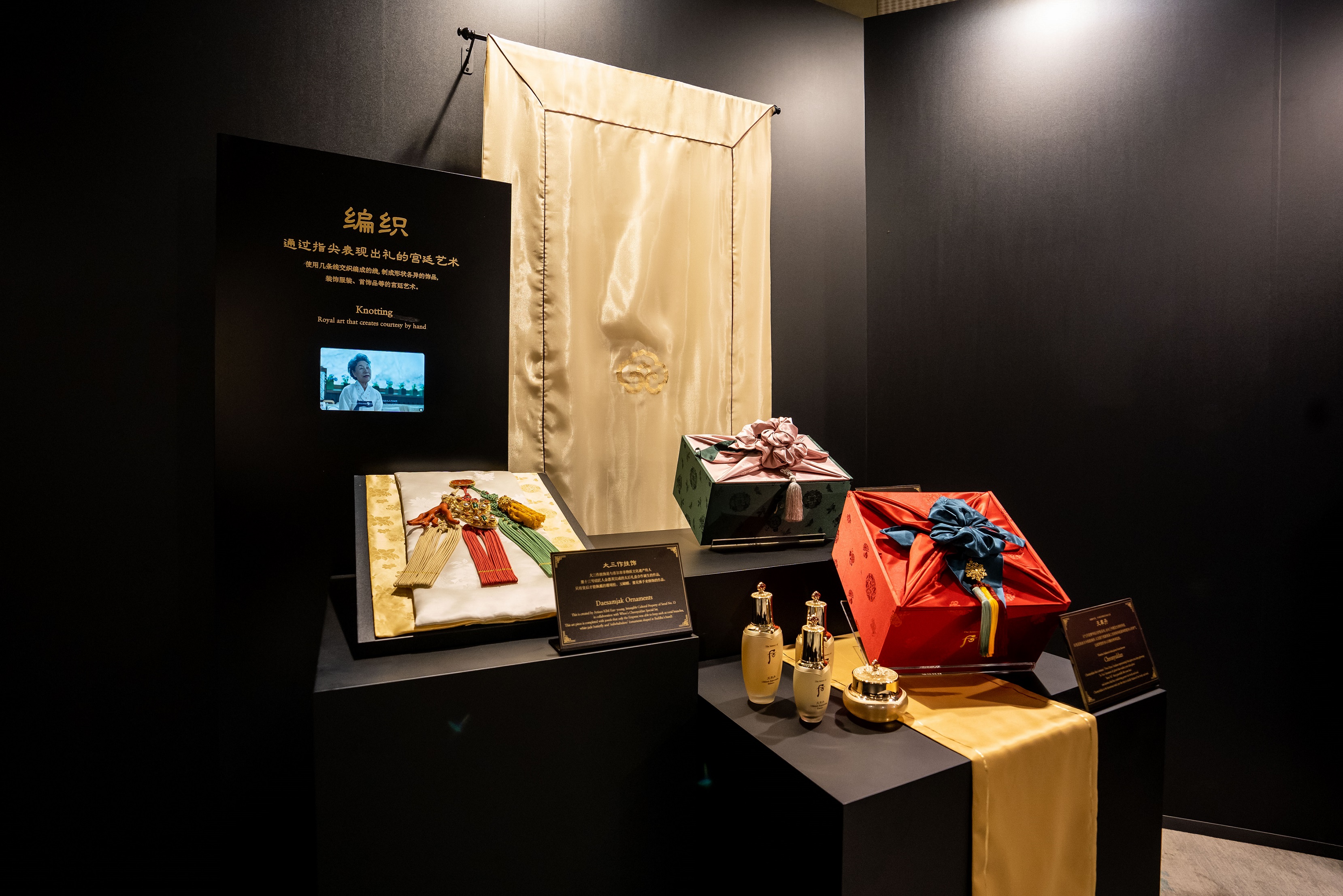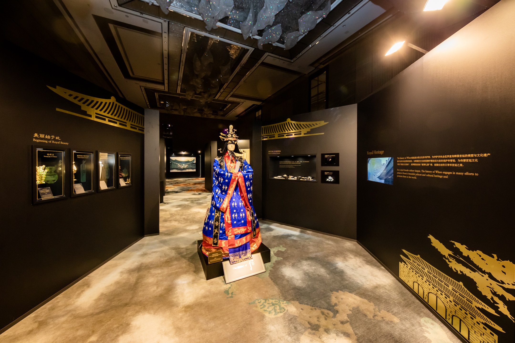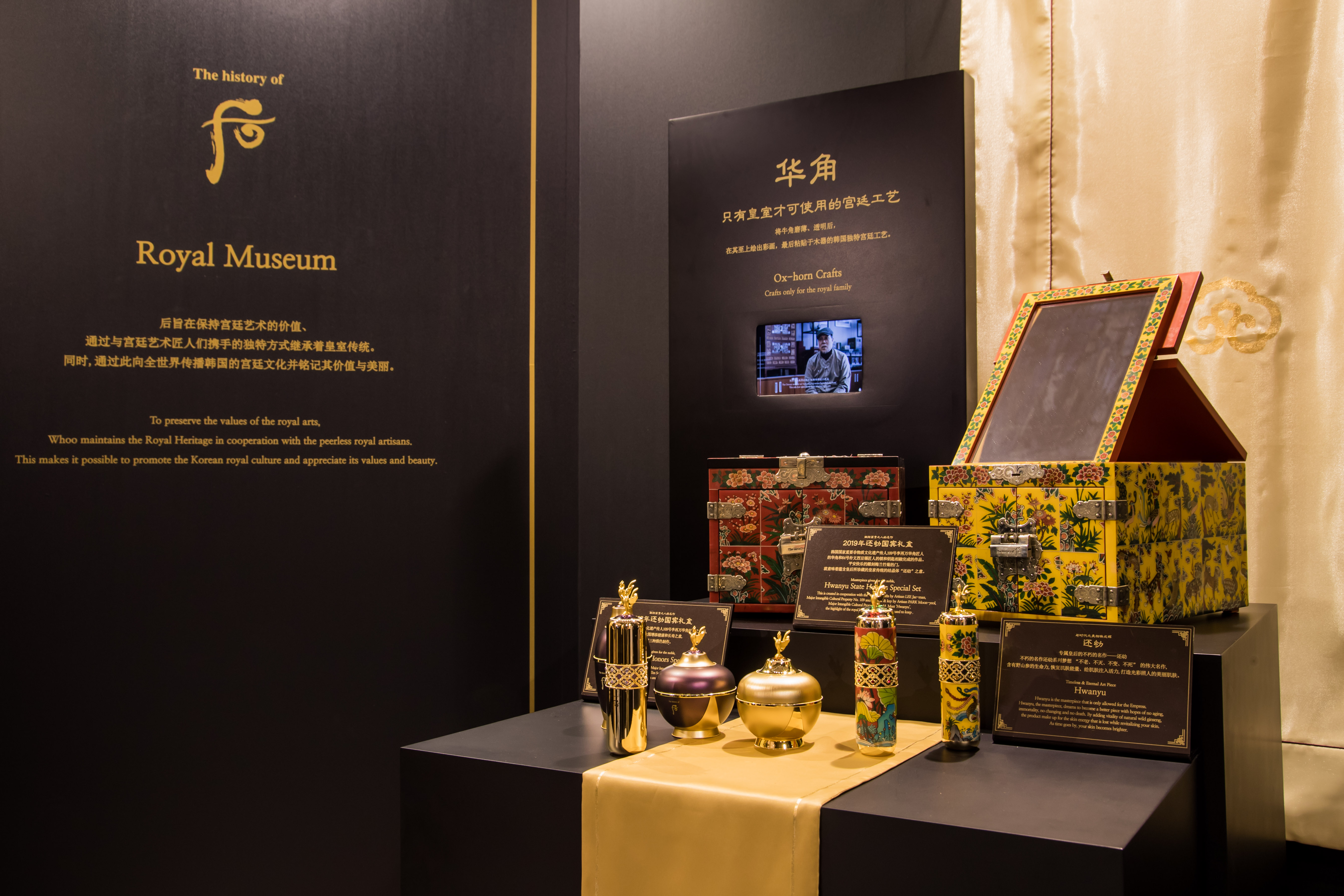 Song song đó là các góc trưng bày nơi quan khách có thể chiêm ngưỡng những hiện vật lịch sử thuộc cung triều xưa giúp tạo nên bản sắc độc nhất của The history of Whoo, cũng như các tuyệt phẩm ứng dụng nghệ thuật chế tác cung đình truyền thống trong hộp đựng cao cấp như khảm ngọc trai, khảm sừng trâu, thêu thùa và kết nút…