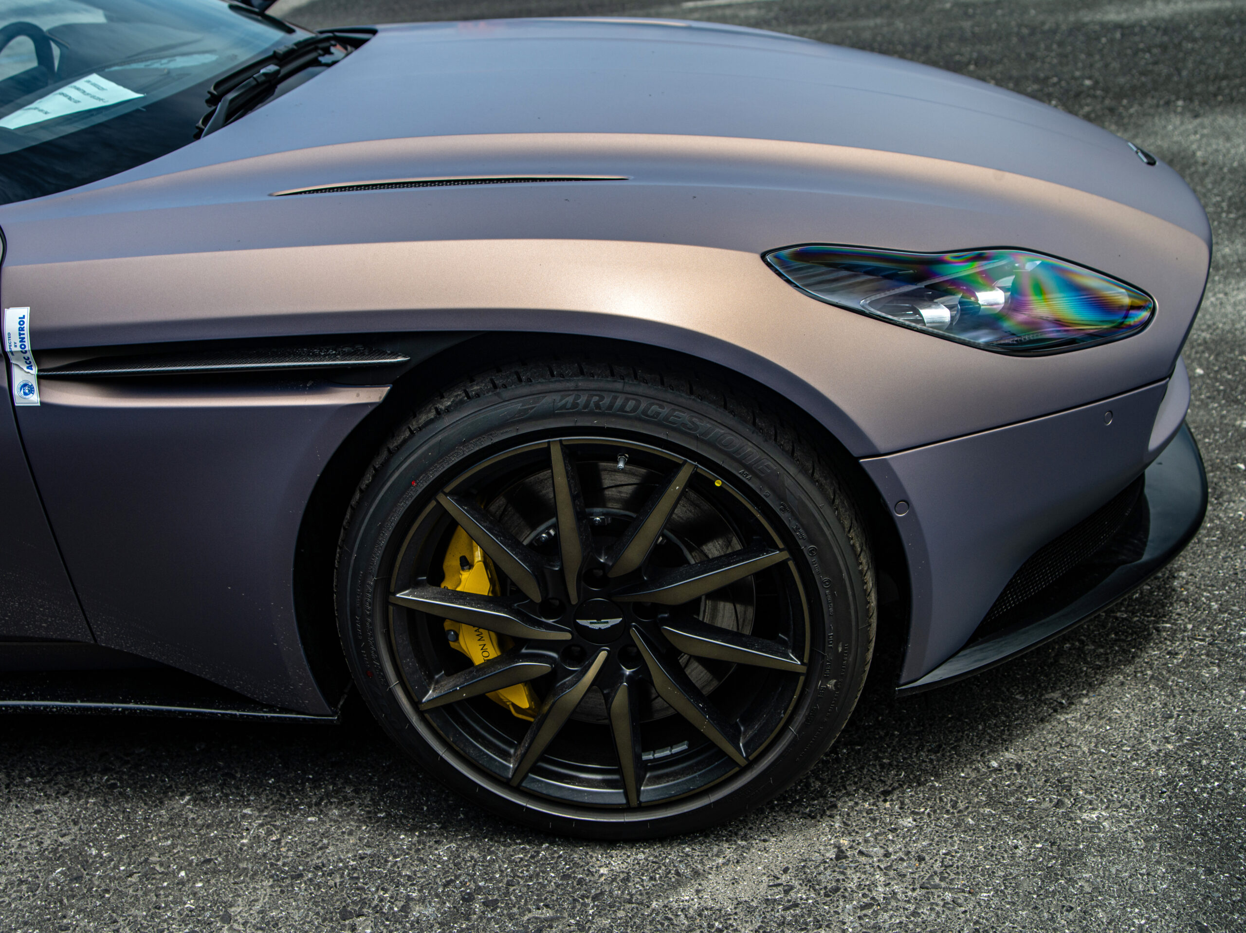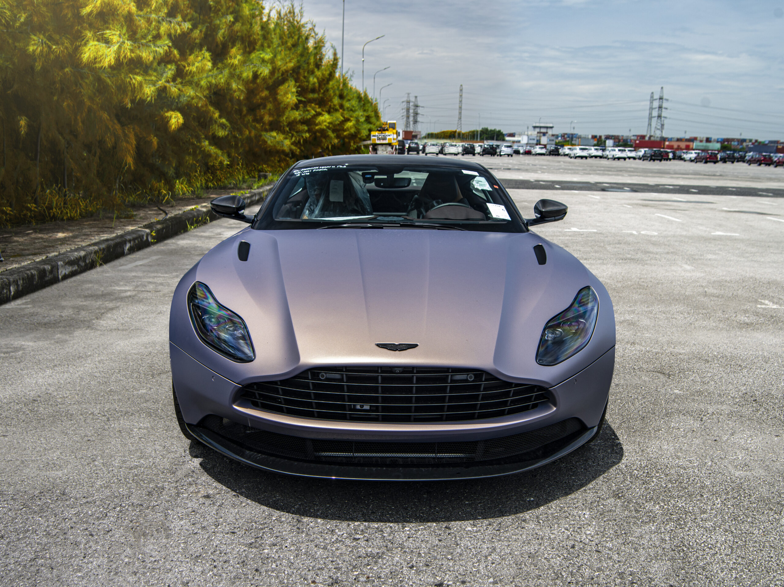 Điểm nhấn ở phần đầu xe vẫn là lưới tản nhiệt với 5 nan ngang và 10 nan dọc tối màu. Phần nắp ca-pô thiết kế hình vỏ sò đi kèm với 2 khe gió lớn (phiên bản V12 có 4 khe). Chiếc Aston Martin DB11 V8 trang bị bộ mâm đa chấu kép phay xước 2 tông màu tương phản, kết hợp với cùm phanh màu vàng phía sau. Thiết kế cản trước đặc trưng của Aston Martin với lưới tản nhiệt nan ngang cỡ lớn và nắp ca-pô mở ngược lạ mắt. Thu hút ánh nhìn nhất ở khu vực thân xe là kiểu cửa thiên nga trứ danh trên các sản phẩm của hãng xe nước Anh.